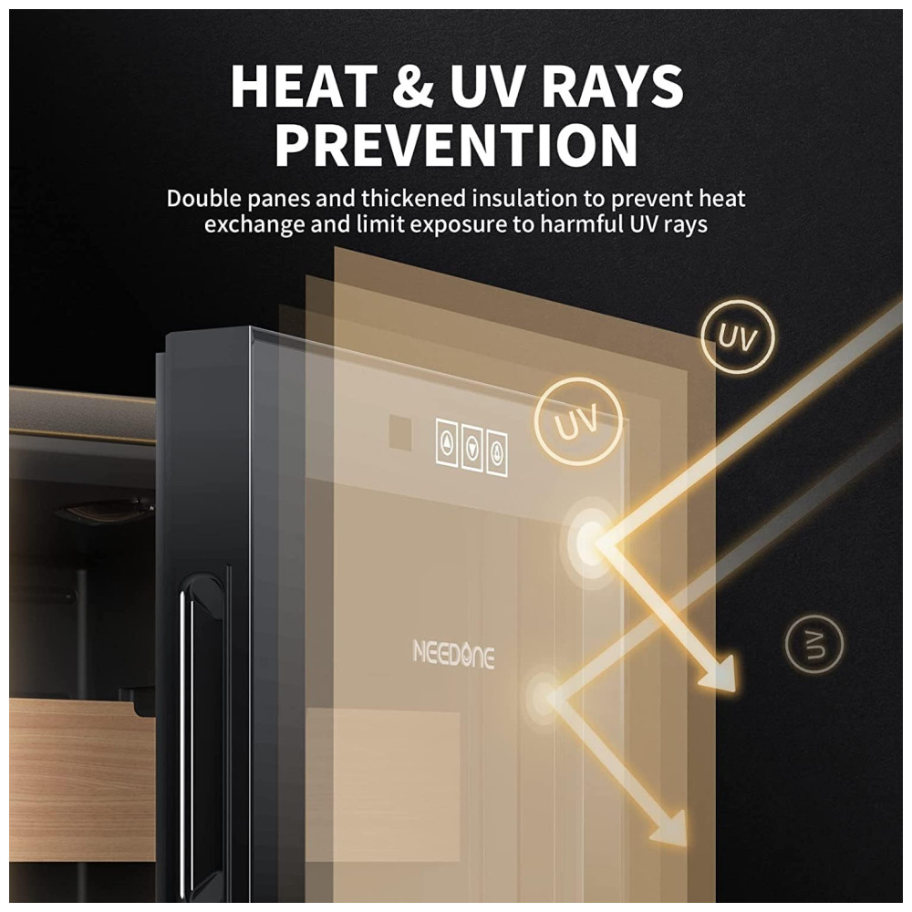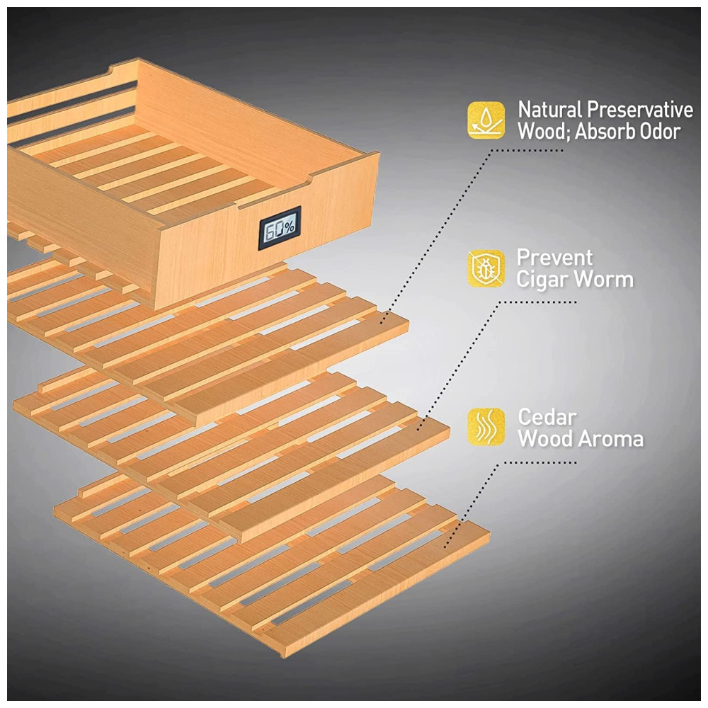 Feito de madeira de cedro sem pintura, as prateleiras e a gaveta estão cheias de um cheiro agradável da natureza. O armário de charutos usa um design de porta de vidro temperado oco de camada dupla. O vidro externo é isolado, protegendo e prevenindo eficazmente os raios ultravioleta, enquanto o vidro interno desempenha um bom papel na preservação do calor.