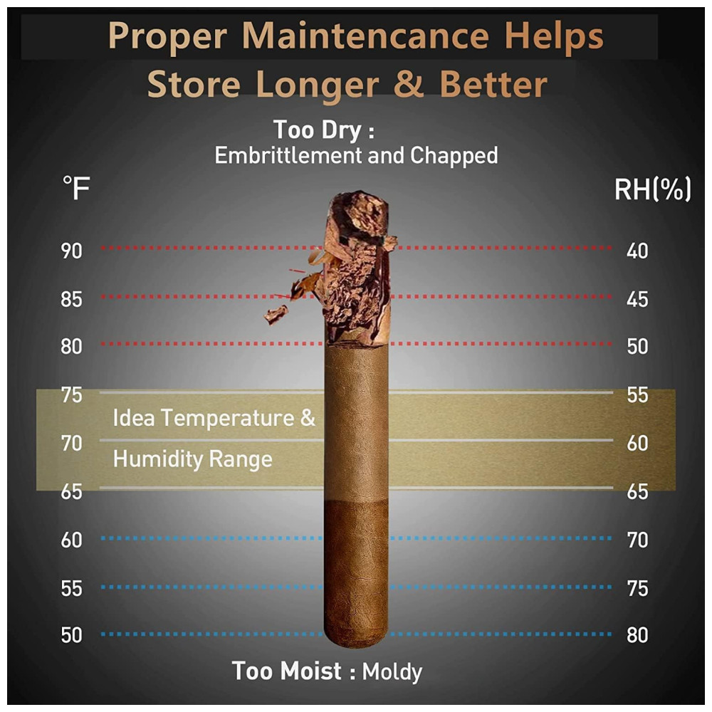 A circulação de ar em circuito fechado pode efetivamente manter a umidade adequada para armazenar charutos. Este umidor de charutos apresenta um sistema de controle automático de umidade sem umidade, com precisão de medição de umidade de 5RH. O pacote de controle de umidade não está incluído e depende da sua necessidade.