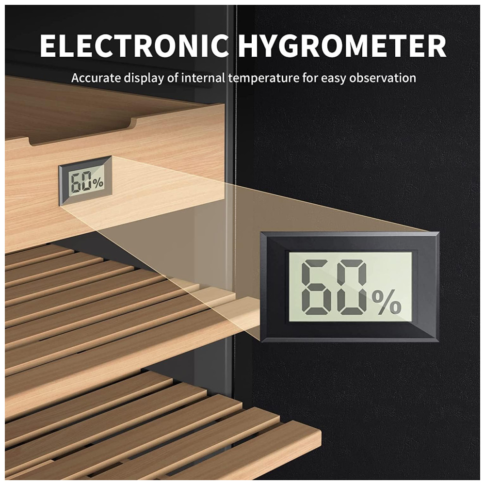 O higrômetro ajuda a monitorar a umidade para que seus charutos estejam no ambiente de armazenamento ideal para melhorar o sabor. Além disso, o ruído é inferior a 38,0 DB. O geladoer de charutos utiliza madeira de cedro espanhol, cujo aroma pode ajudar a promover o envelhecimento dos charutos, melhorar o aroma dos charutos e tornar o sabor dos charutos quase perfeito.