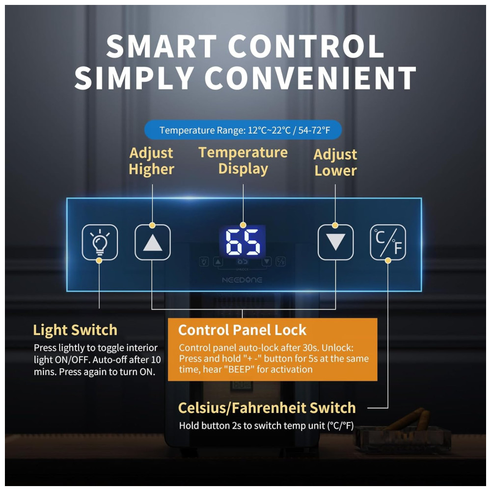 Integração Semi-Heat & Cool: Combina perfeitamente refrigeração e aquecimento, adaptando-se a cada estação. Mantém as temperaturas com precisão dentro de 12,2-22,2°C (±0,5°C). Alternância fácil entre Fahrenheit e Celsius, adicionando funcionalidade amigável. Alcance a temperatura ideal para envelhecer e amadurecer sua coleção com precisão.