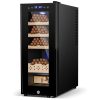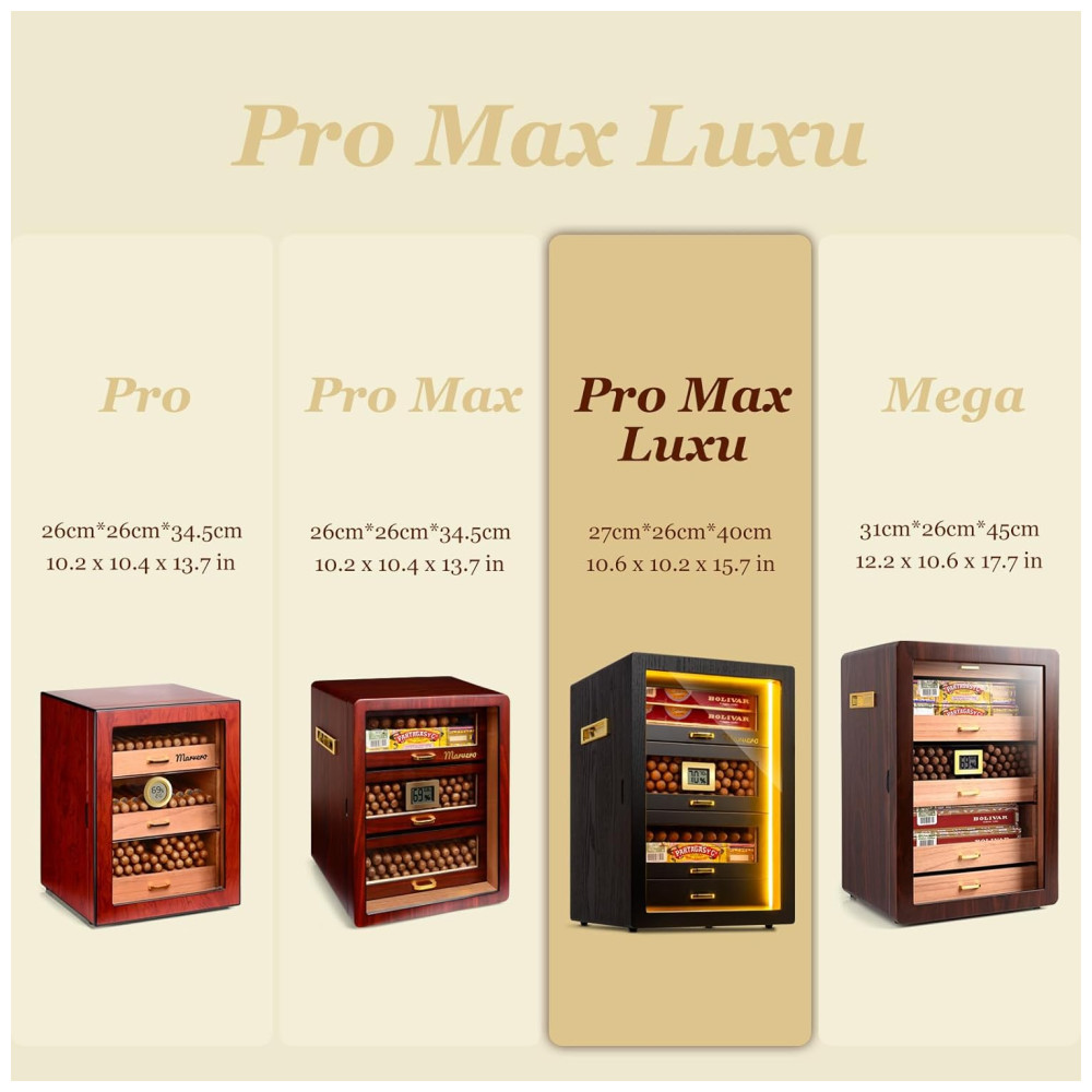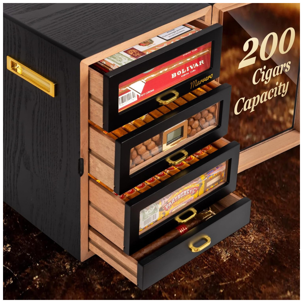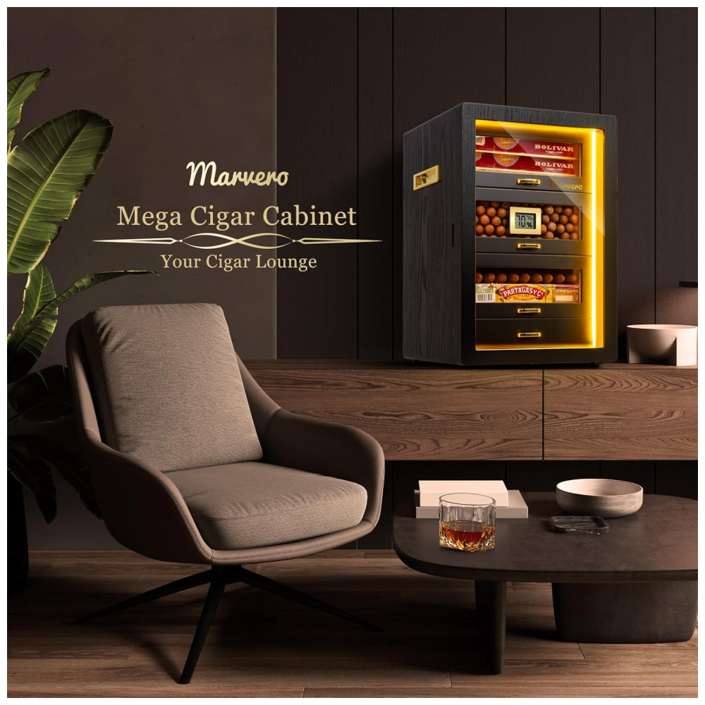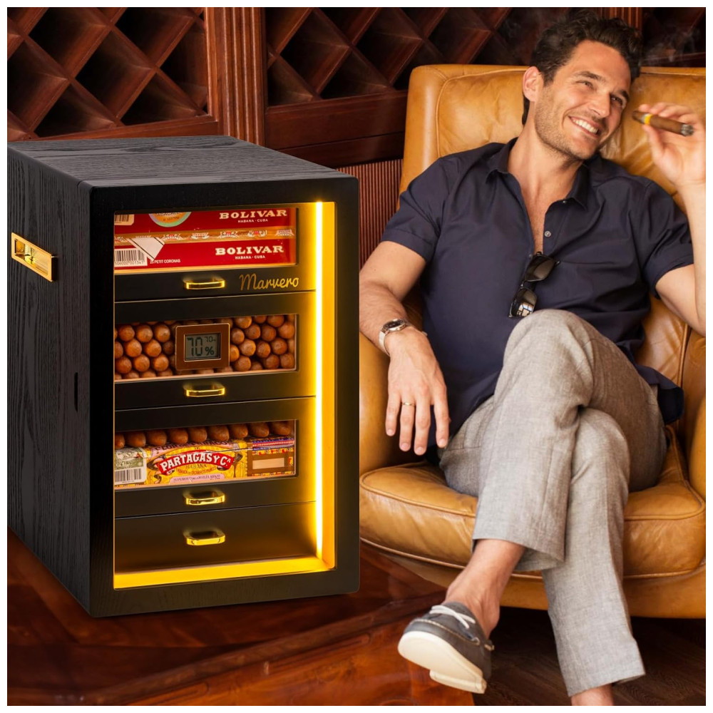 O umidor de Charuto da Marvero tem capacidade para 200 charutos e oferece 5 gavetas de cedro removíveis com alças, ideais para a maioria dos umidificadores de charutos elétricos. Feito com materiais de qualidade, como revestimento de cedro natural que mantém a umidade e o frescor dos charutos, e uma durável porta de vidro temperado que permite uma fácil observação dos níveis de umidade, garantindo proteção abrangente para sua coleção de charutos. Com um design maravilhoso, com gabinete arredondado, gaveta de noz marrom e hardware banhado a ouro em ambos os lados, o umidor da Marvero se destaca no mercado. Possui 4 umidificadores, 2 pacotes de umidade e um higrômetro digital frontal para monitoramento fácil da umidade. Além disso, conta com um sistema de iluminação LED trilateral para facilitar a observação dos charutos e pode ser alimentado por bateria ou cabo Type-C, oferecendo portabilidade e confiabilidade. Um presente esplêndido para apreciadores, ideal para bares, escritórios ou estudos. Perfeito como presente para pais, maridos ou amigos.
