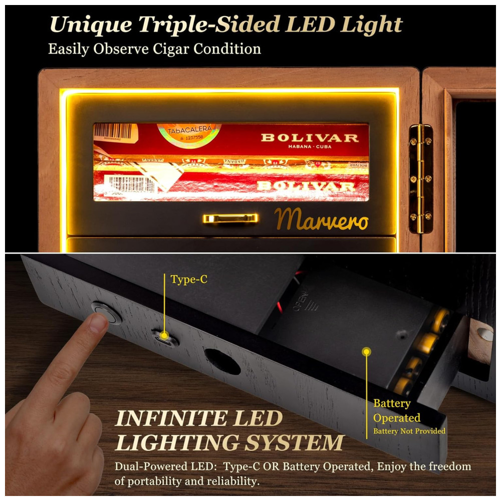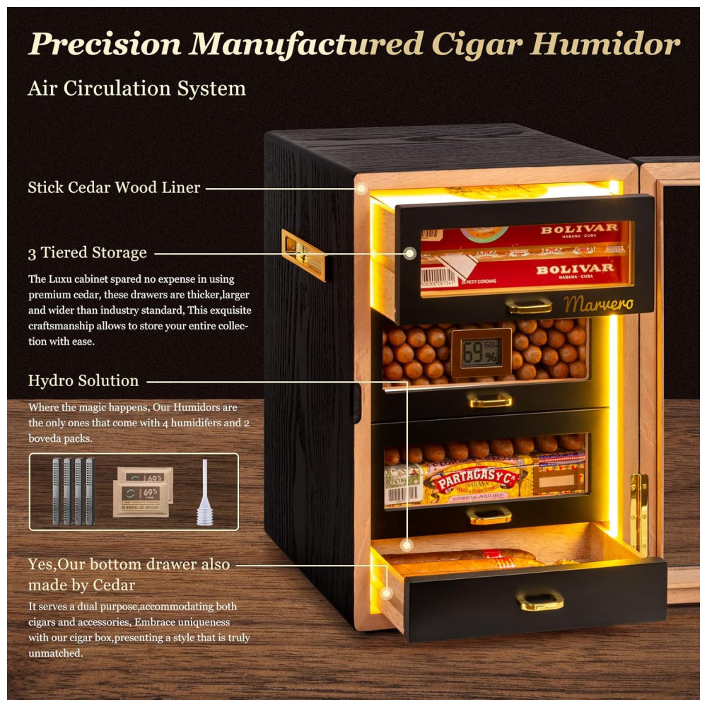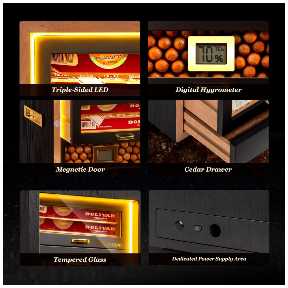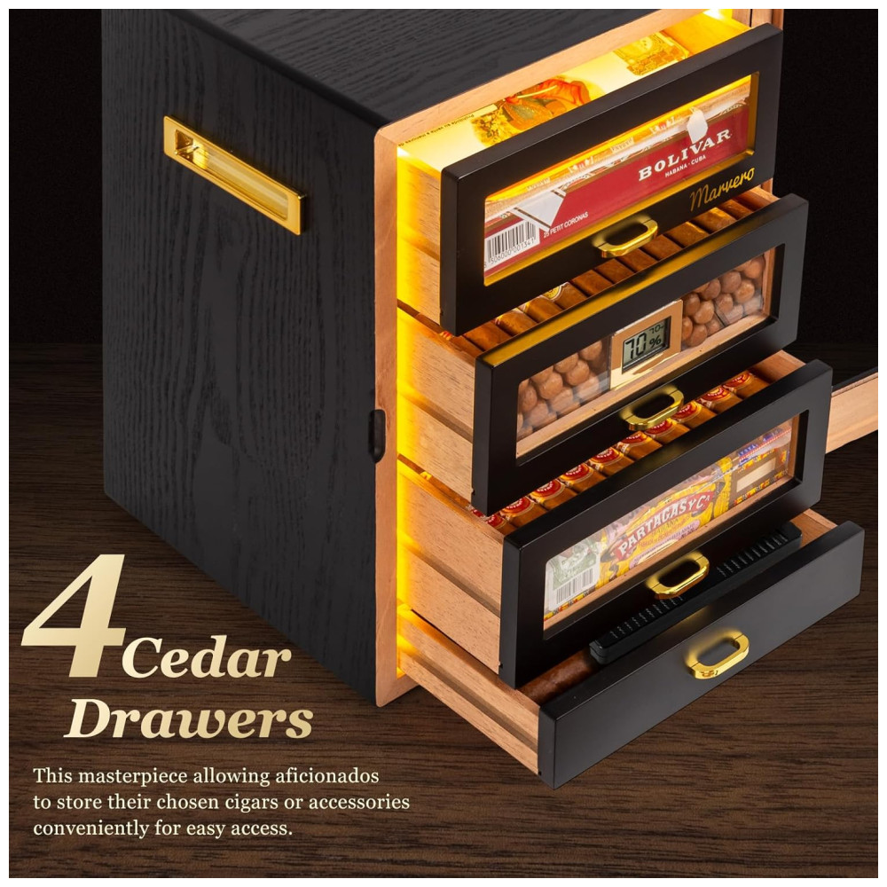 Umidor para Charutos Marvero com Higrômetro Digital e Umidificador Iluminação LED e 4 Gavetas de Cedro Pacotes de Umidade.