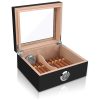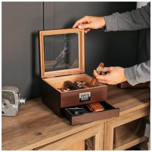 O Umidor Glass Top da CASE ELEGANCE apresenta um Higrômetro Digital Personalizado projetado para precisão absoluta, com vedação completa para leitura de umidade mais exata do mercado. Com generosa quantidade de cedro espanhol, preserva a umidade e a qualidade dos seus charutos. O exclusivo Canal Hydro de umidificação proporciona controle flexível de umidade, com instruções detalhadas e suporte. Inclui 2 canais Hydro, gel de cristal, solução para umidificador e capacidade para até 50 charutos. Mantenha sua coleção organizada e protegida. A elegância unida à funcionalidade para uma experiência premium.