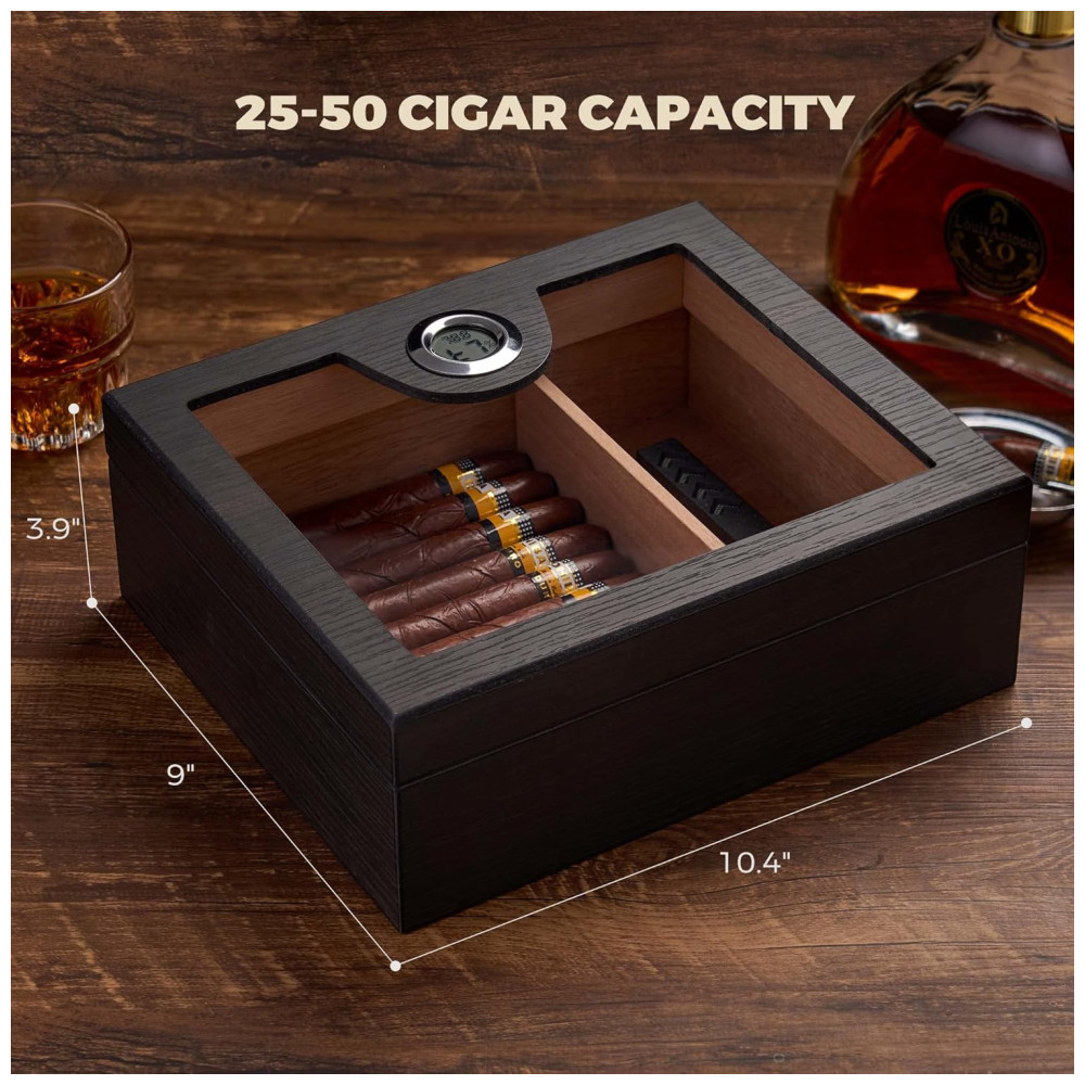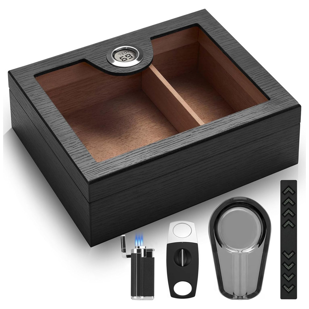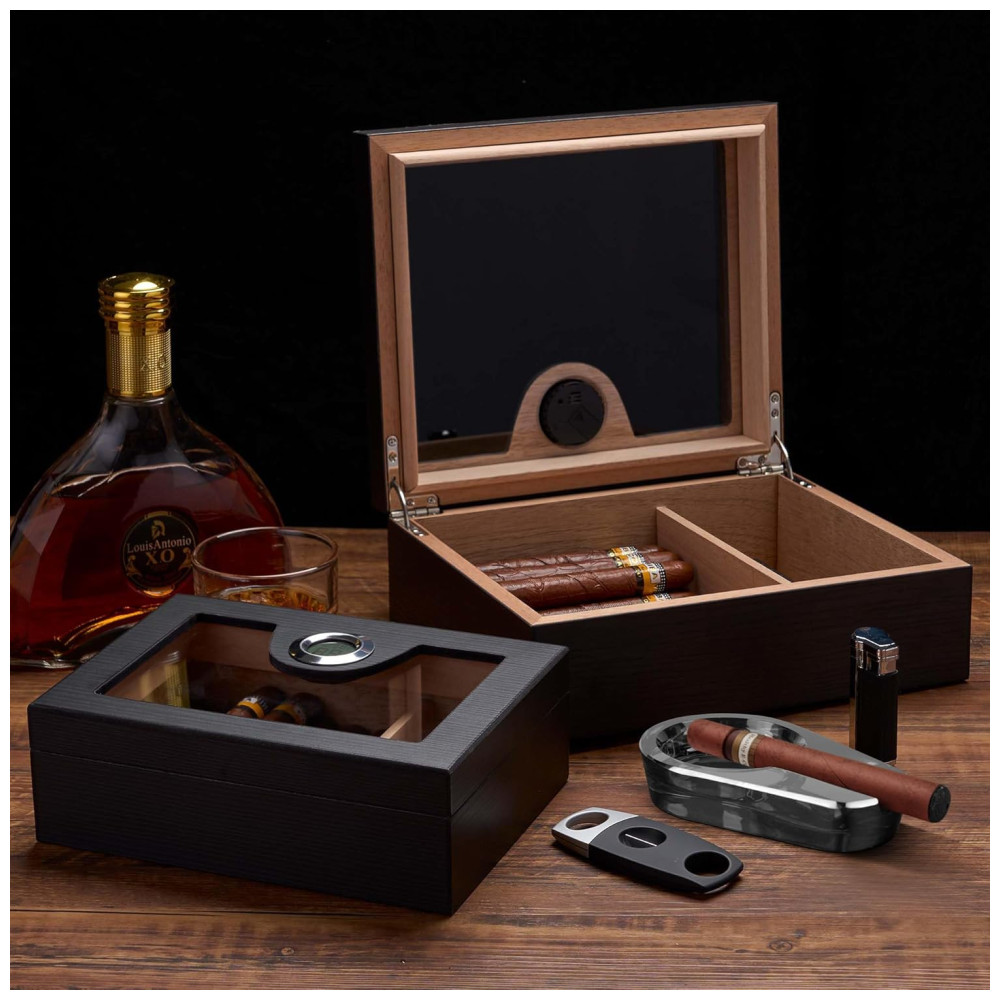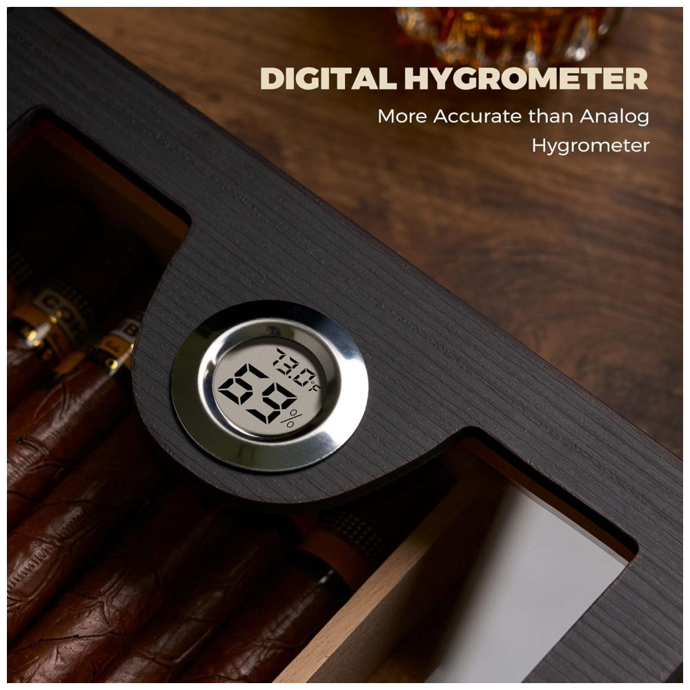 Mantenha seus charutos frescos e perfeitamente conservados com o umidor Cinorow, projetado para preservar a qualidade, independentemente do tempo de armazenamento. Com sistema de umidificação preciso e tampa justa, mantém os níveis de umidade estáveis e seus charutos protegidos. Além disso, acompanha higrômetro digital, umidificador, divisor de cedro espanhol, isqueiro, cortador e cinzeiro, proporcionando uma experiência completa. Disponível em capacidades para 25 ou 50 charutos, com divisória removível. Fácil de usar, monitora e ajusta os níveis de umidade com precisão, garantindo o envelhecimento correto dos charutos. Além de funcional, é elegante e durável, com design sofisticado e materiais de alta qualidade, perfeito para qualquer ambiente.