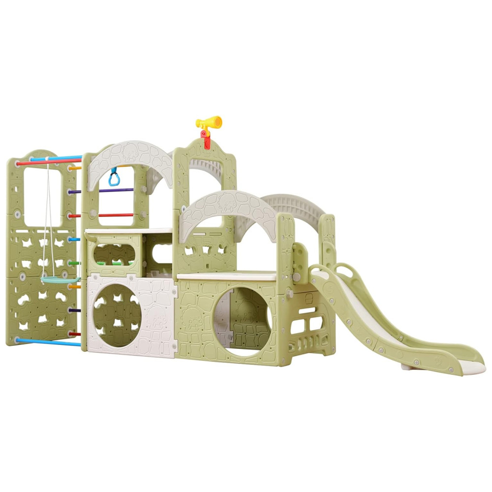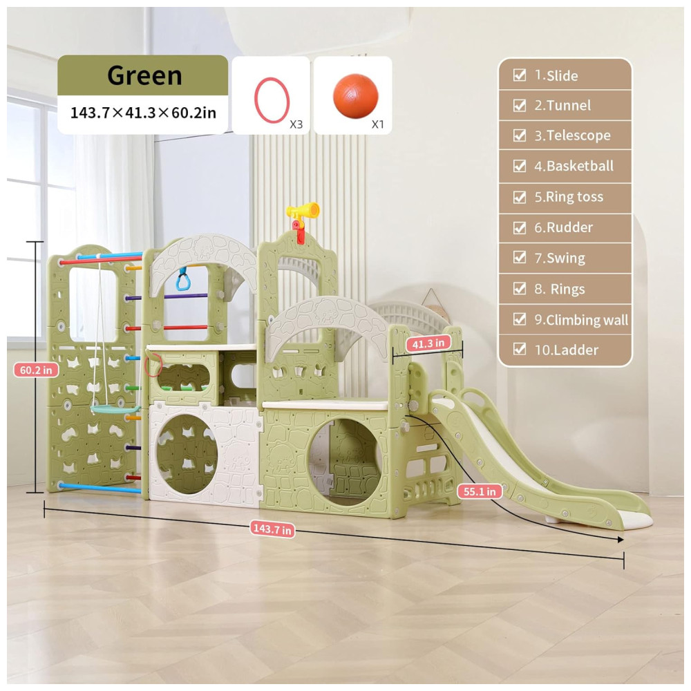 Desbloqueie 10 maneiras de brincar! Libere a imaginação de seu filho e aprimore sua coordenação física e habilidades motoras com este versátil playground indoor, que apresenta um tobogã, parede de escalada, escada, balanço, cesta de basquete, jogo de argolas, basquete, túnel e muito mais! Robusto e Seguro, projetado com degraus antiderrapantes, corrimãos robustos e construção amiga dos joelhos, este playground infantil proporciona uma experiência divertida e segura para o seu pequeno. Além disso, possui um acabamento sólido e superfícies lisas para facilitar a limpeza e proteger seu filho de arranhões. Seguro e Eco-friendly, feito com material PP de alta qualidade, inodoro e durável, e estruturado com vigas de aço robustas, este playground garante um ambiente seguro para escaladas indoor para seu filho. Melhor Presente para Seu Filho, nosso tobogã 10 em 1 é uma escolha excelente para presentear seu filho em ocasiões especiais como aniversários, feriados, Natal e muito mais. Fácil de Montar, a montagem é simples e todas as ferramentas estão incluídas. Este conjunto de brinquedos é leve e fácil de mover, mas robusto, com uma estrutura estável sob compressão. Transforme qualquer espaço em um vibrante playground indoor para crianças em idade pré-escolar.