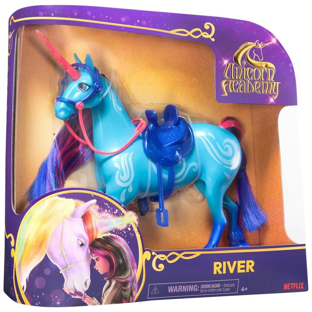 Complete sua coleção de bonecas da Unicórnio Academy com o unicórnio de Isabel, River Inspirado no programa de animação da NETFLIX e na série de livros mais vendidos onde a amizade reina, este brinquedo unicórnio River de 27 cm dá vida à criatura gentil e tímida. Lindamente detalhado, River apresenta marcas peroladas de Water Magic em sua lateral, chifre majestoso e brilhante, crina e cauda coloridas e acessórios removíveis para boneca com freio e sela para brincadeira adicional.