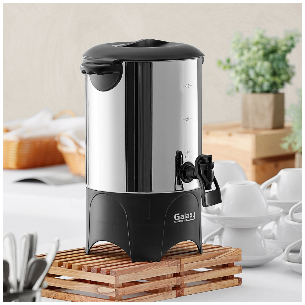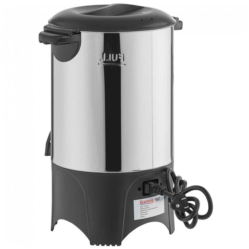 Alças de plástico auxiliam no transporte, e torneira de plástico evita gotejamento no serviço. Design de parede única mantém temperatura após preparo. Requer conexão elétrica 120V com potência de 1.000 W. Indicada para urnas de café elétricas em estações de bebidas profissionais.