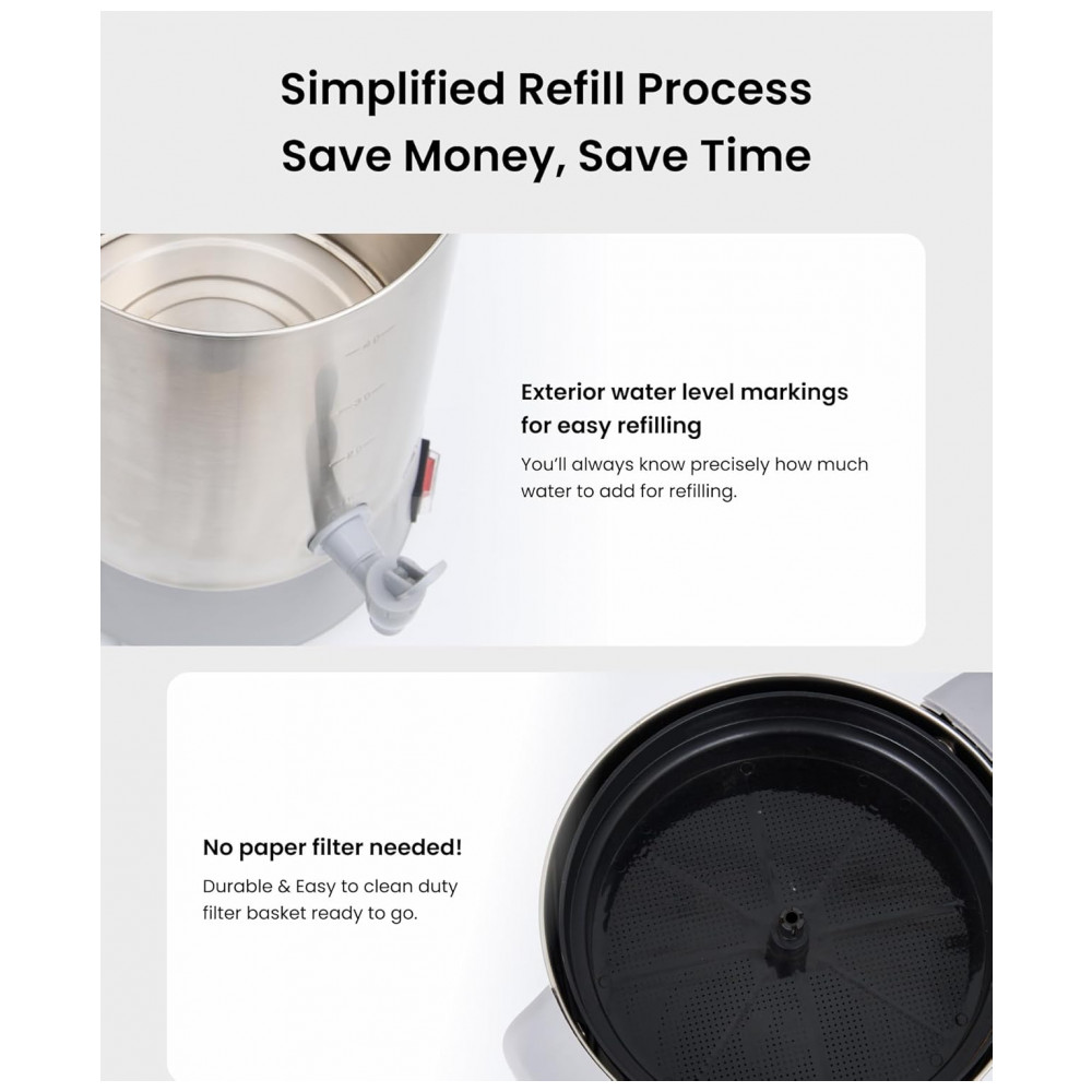 O equipamento conta com filtro removível reutilizável, eliminando a necessidade de filtros de papel e facilitando a limpeza. Seu design inclui alças com toque frio para transporte seguro e bico dispensador anti-gotejamento, garantindo precisão e limpeza no serviço. A urna possui indicador visual do nível de café, luzes indicativas de aquecimento e manutenção da temperatura ideal, além de base antiderrapante para maior estabilidade. Funciona em voltagem 110 volts com certificação ETL Intertek garantindo padrão de segurança.