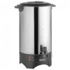 Construída em aço inoxidável com acabamento espelhado, oferece estrutura resistente para uso prolongado. O design de parede única mantém a temperatura do café após o preparo. Cabos e torneira em plástico facilitam o transporte e o despejo sem gotejamento.