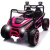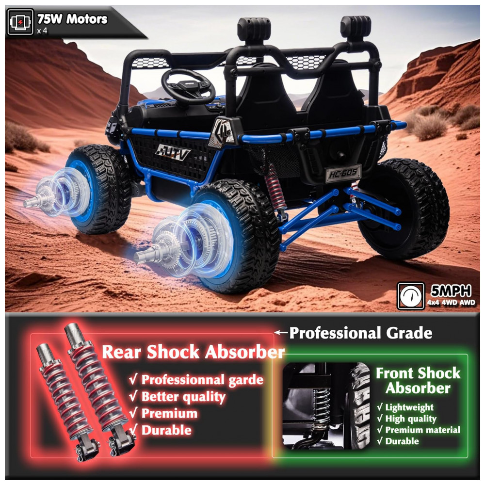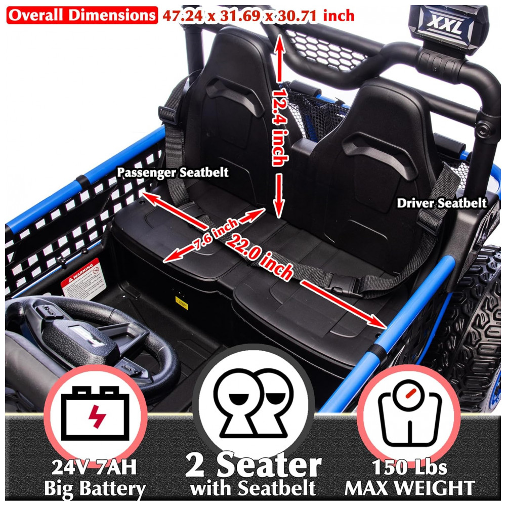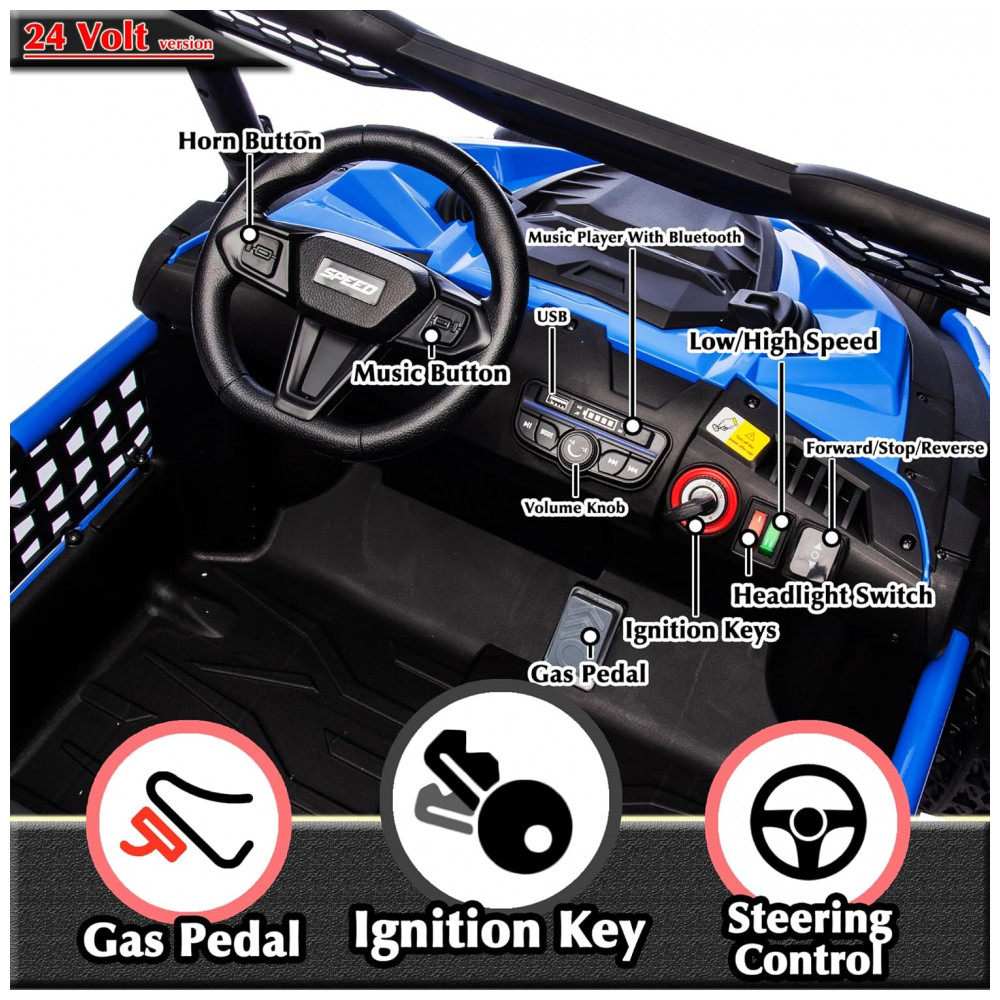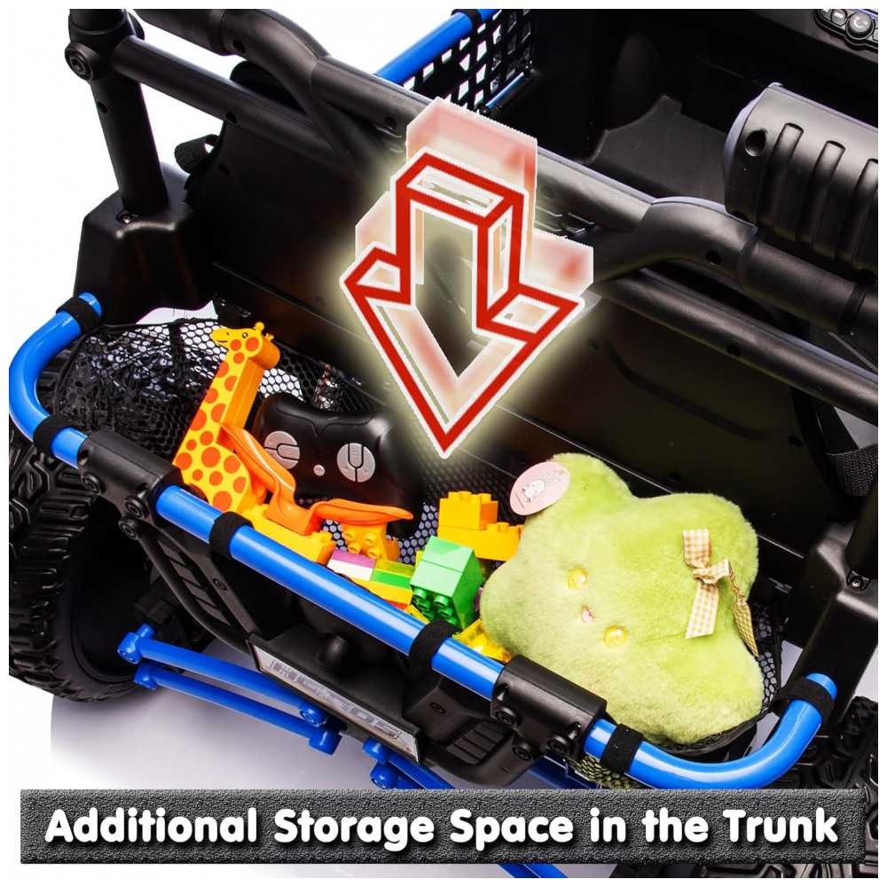 O UTV elétrico infantil sopbost entrega performance off-road para até dois ocupantes, com estrutura reforçada em metal e design XXL, assento de 22” e capacidade máxima de 68 kg. Equipado com bateria de 24V 7Ah, quatro motores de 75W, pneus EVA antiderrapantes e suspensão por molas em todas as rodas para absorção de impactos. Painel integrado com música pré-definida, entrada USB e conectividade Bluetooth para áudio durante a condução. Controle remoto parental com três velocidades e modo manual via pedal e volante. Indicadores de segurança: partida suave, estrutura estável, botão de buzina, faróis funcionais e painel sonoro. Indicado para crianças a partir de 3 anos, para aventuras em gramados, cascalho, terra e pisos residenciais.