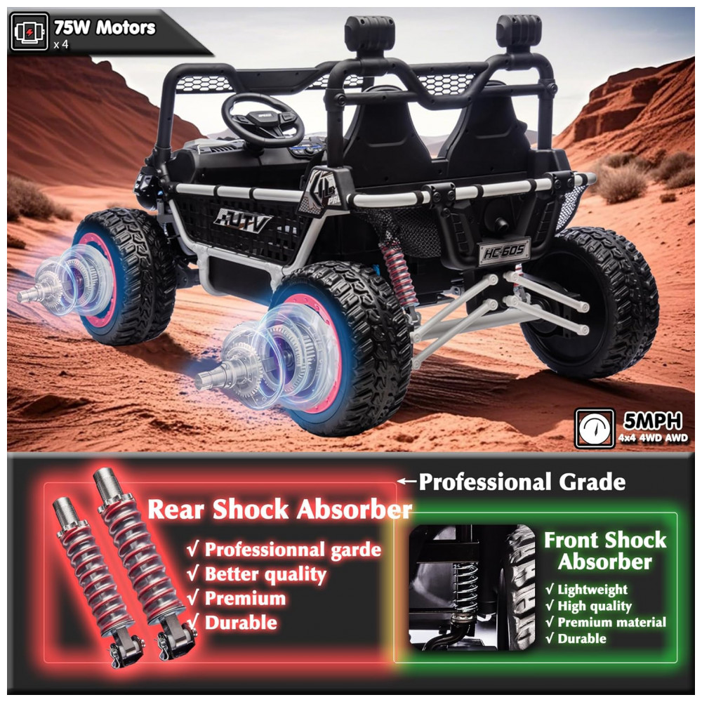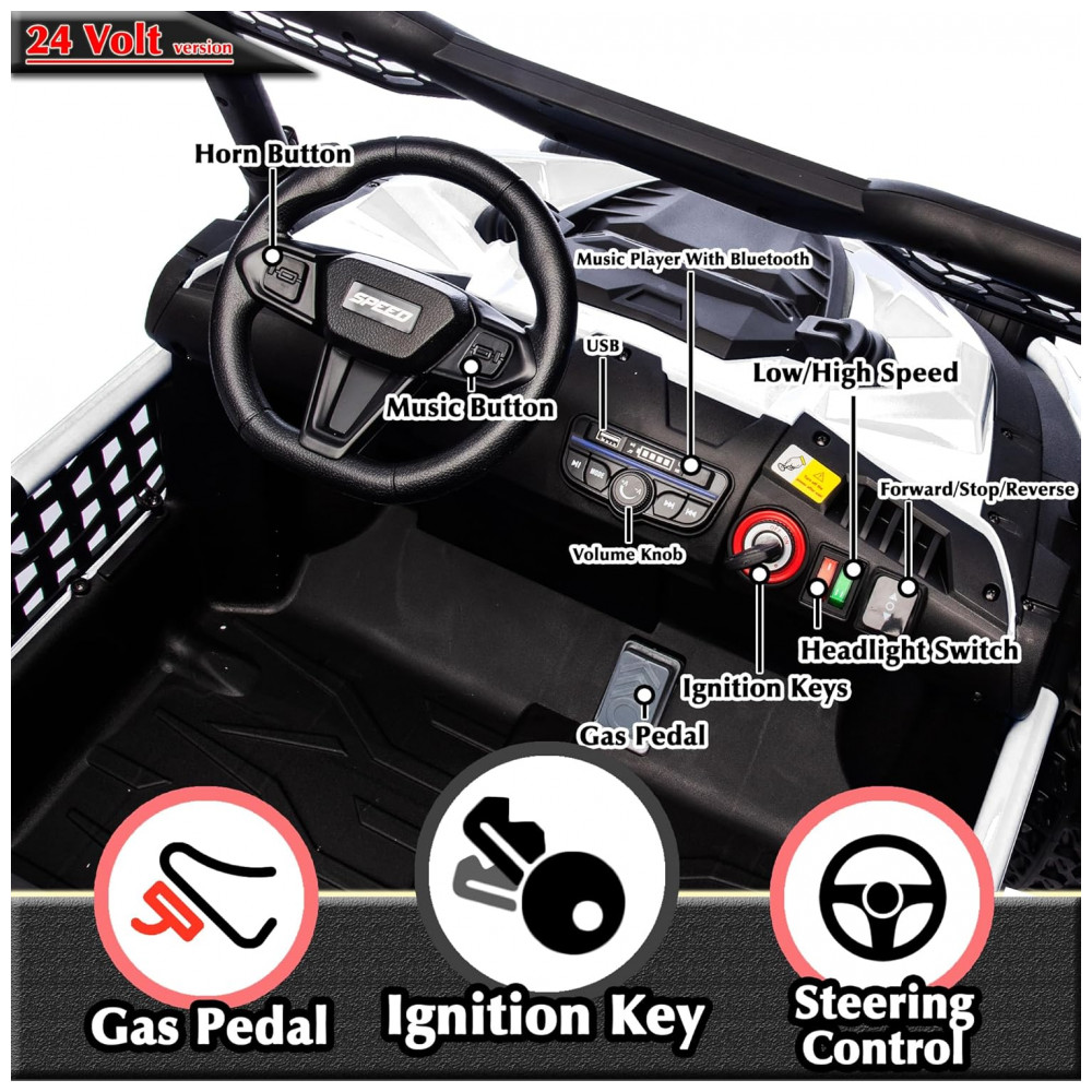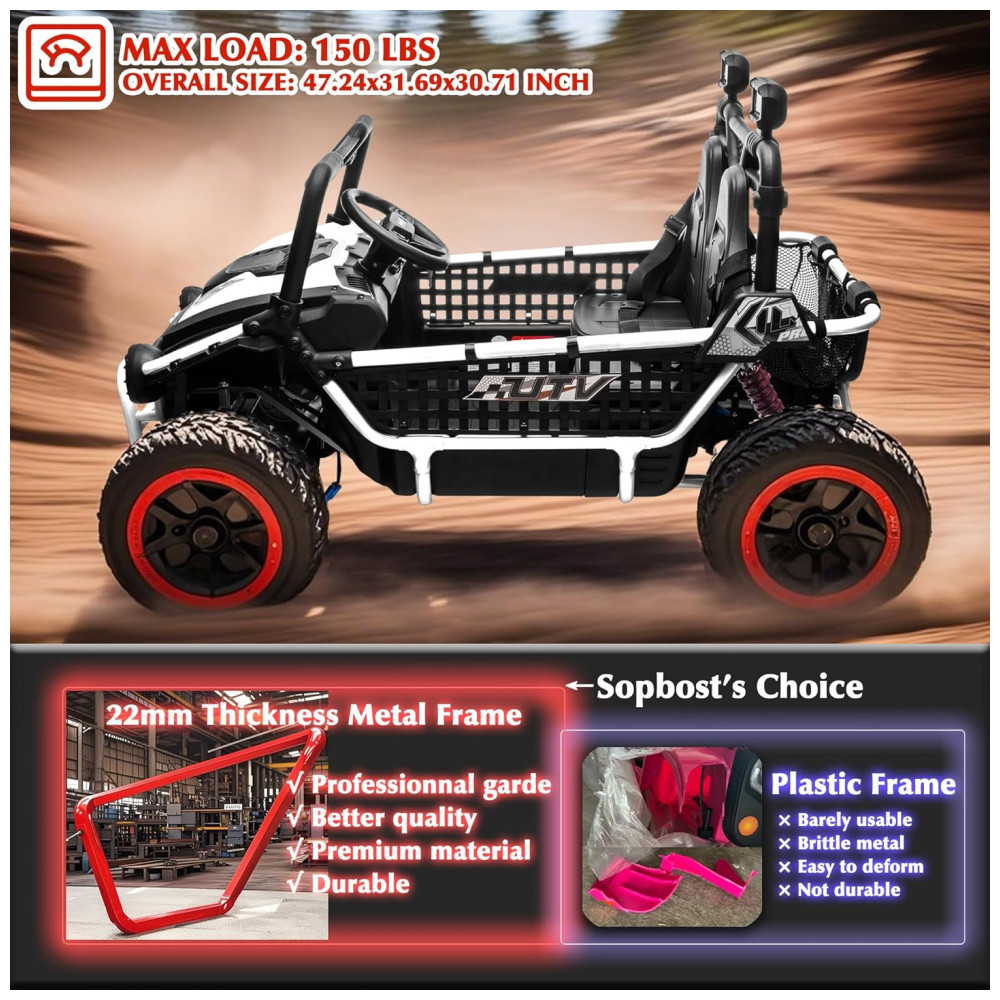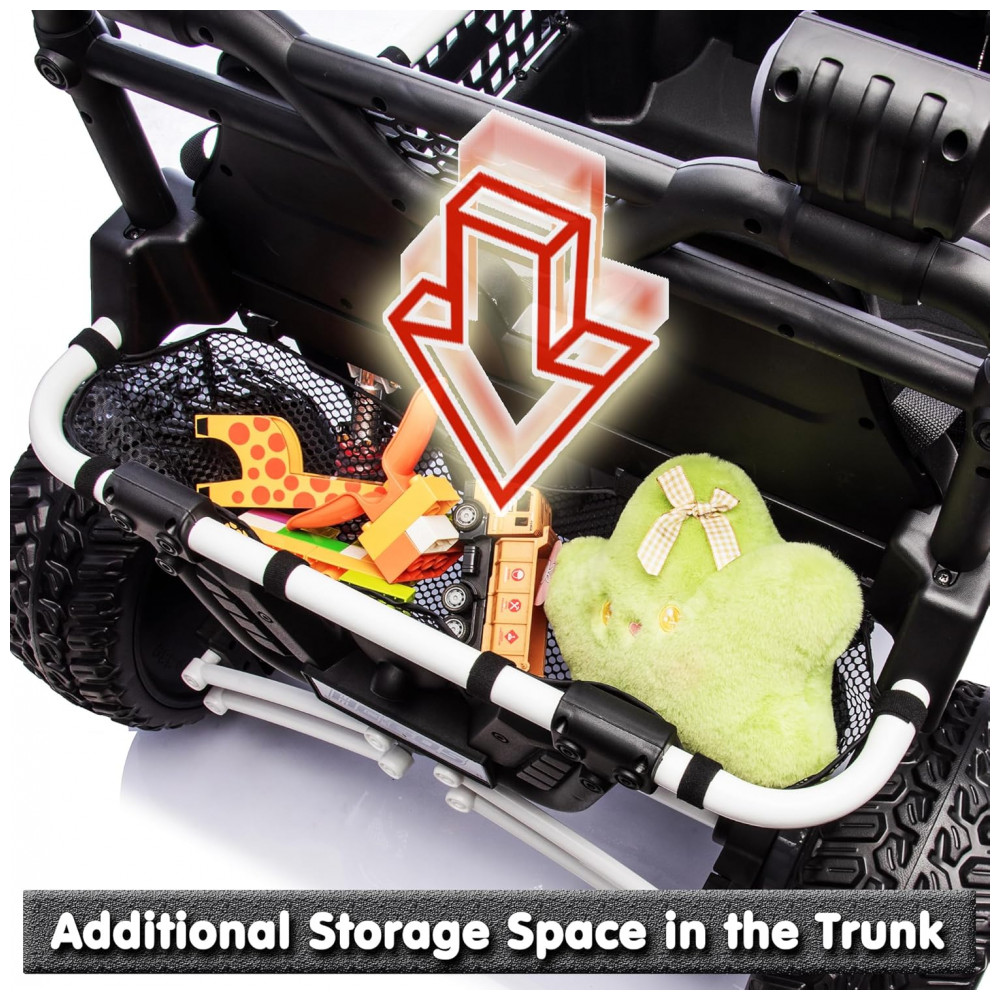 O UTV elétrico infantil sopbost entrega performance off-road para até dois ocupantes, com estrutura reforçada em metal e design XXL, assento de 22” e capacidade máxima de 68 kg. Equipado com bateria de 24V 7Ah, quatro motores de 75W, pneus EVA antiderrapantes e suspensão por molas em todas as rodas para absorção de impactos. Painel integrado com música pré-definida, entrada USB e conectividade Bluetooth para áudio durante a condução. Controle remoto parental com três velocidades e modo manual via pedal e volante. Indicadores de segurança: partida suave, estrutura estável, botão de buzina, faróis funcionais e painel sonoro. Indicado para crianças a partir de 3 anos, para aventuras em gramados, cascalho, terra e pisos residenciais.