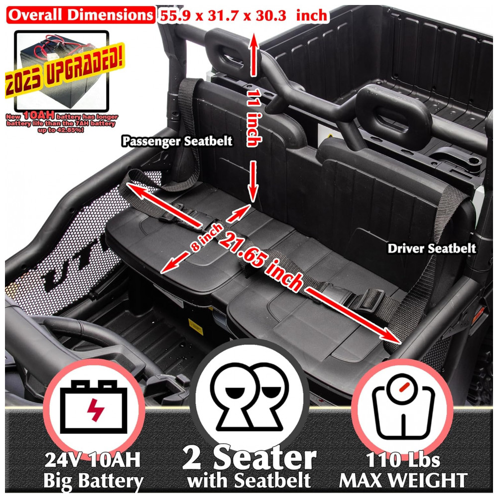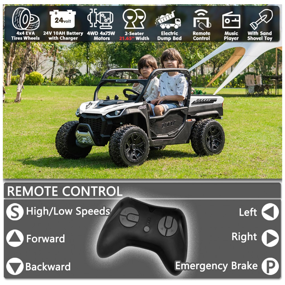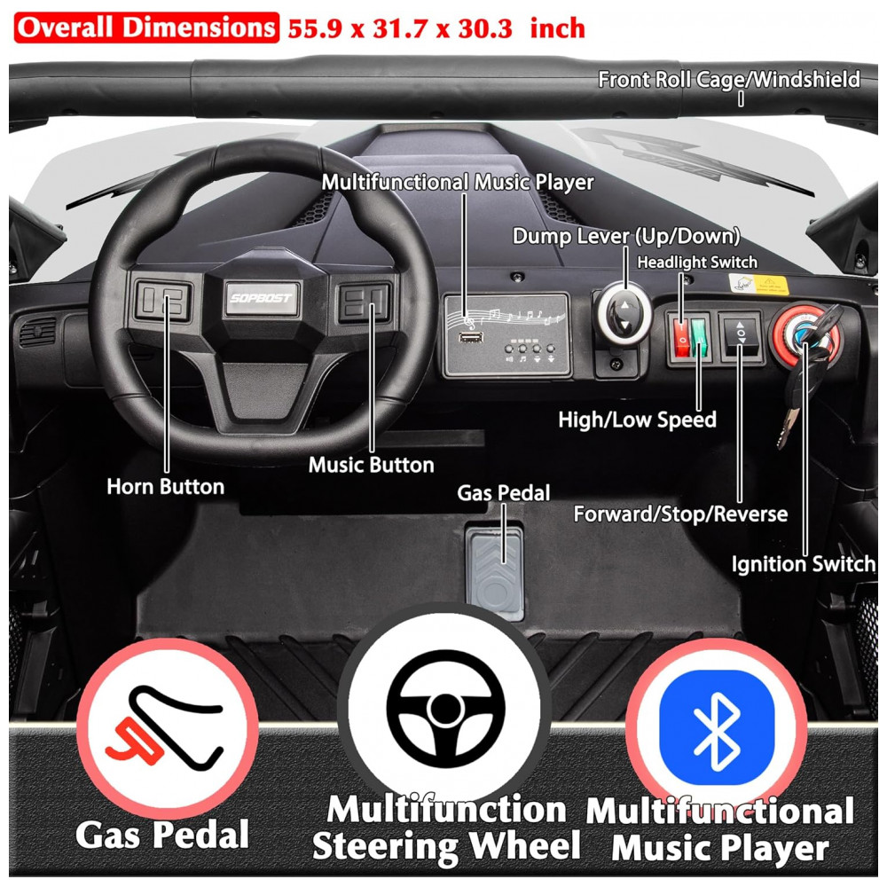 UTV Infantil Elétrico Sopbost Branco e Preto 24V 2 Lugares 4 Motores 75W Caçamba Grande Automática 4WD Pneus EVA Controle Bluetooth 10Ah