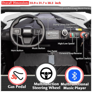 Recursos: rádio, painel musical, Bluetooth, USB, som de motor, buzina, partida por chave, barra de proteção superior, trava nas portas