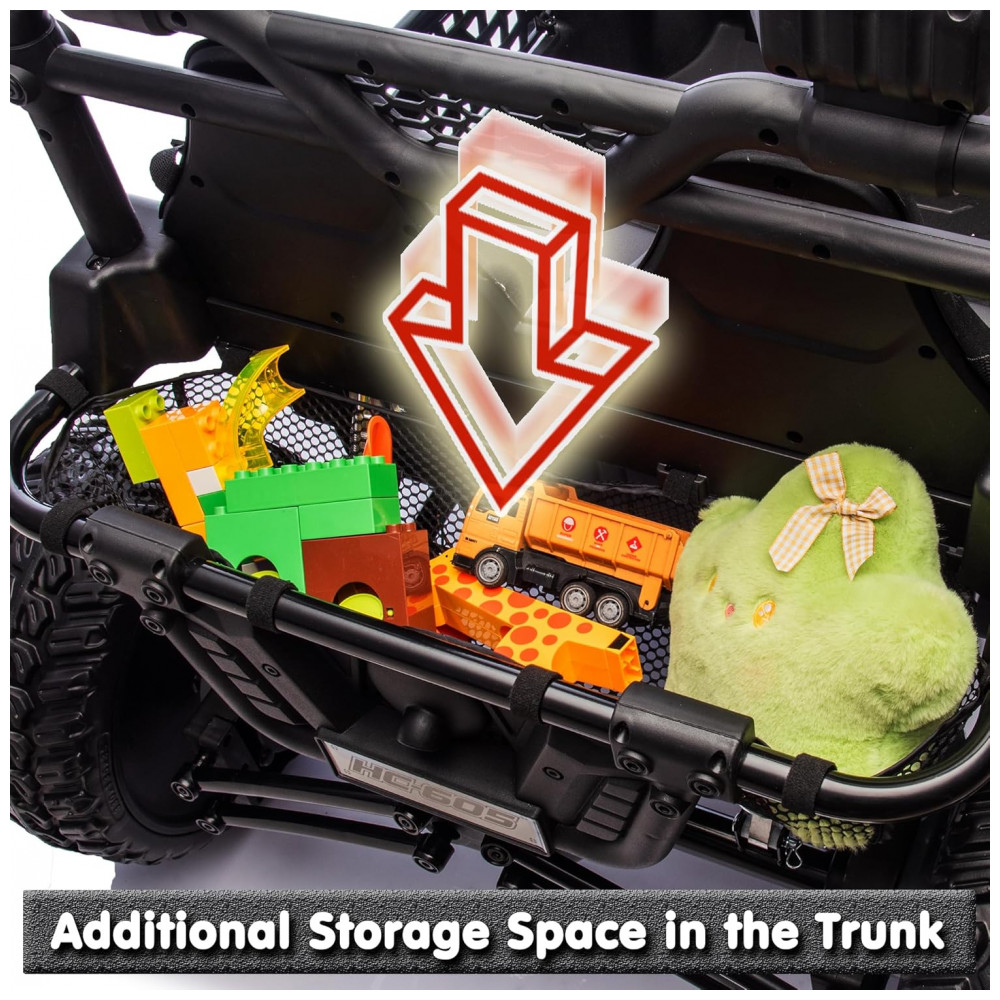 O UTV elétrico infantil sopbost entrega performance off-road para até dois ocupantes, com estrutura reforçada em metal e design XXL, assento de 22” e capacidade máxima de 68 kg. Equipado com bateria de 24V 7Ah, quatro motores de 75W, pneus EVA antiderrapantes e suspensão por molas em todas as rodas para absorção de impactos. Painel integrado com música pré-definida, entrada USB e conectividade Bluetooth para áudio durante a condução. Controle remoto parental com três velocidades e modo manual via pedal e volante. Indicadores de segurança: partida suave, estrutura estável, botão de buzina, faróis funcionais e painel sonoro. Indicado para crianças a partir de 3 anos, para aventuras em gramados, cascalho, terra e pisos residenciais.