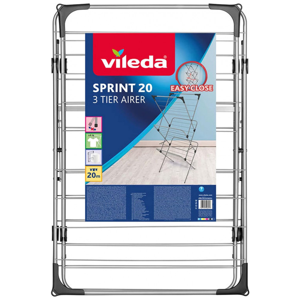 O Vileda Sprint 20 é um arejador de aço resistente de 3 camadas com mecanismo de abertura e fechamento fácil de usar. Comprimento da linha de 20m com 4 ganchos extras para pendurar roupas. Tamanho quando montado 61,5 centímetros de largura x 61 centímetros de profundidade x 147 centímetros de altura Tamanho quando dobrado 61,5 de largura x 6 x 91 centímetros de altura 20 metros de espaço para secagem Fácil de abrir e fechar Pés antiderrapantes para evitar arranhões em pisos duros Economia de espaço e compacto quando dobrado Estrutura de aço resistente Quatro ganchos para pendurar cabides