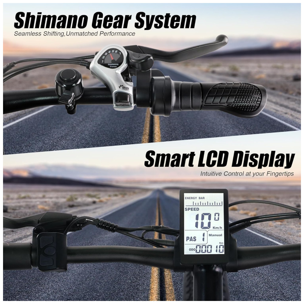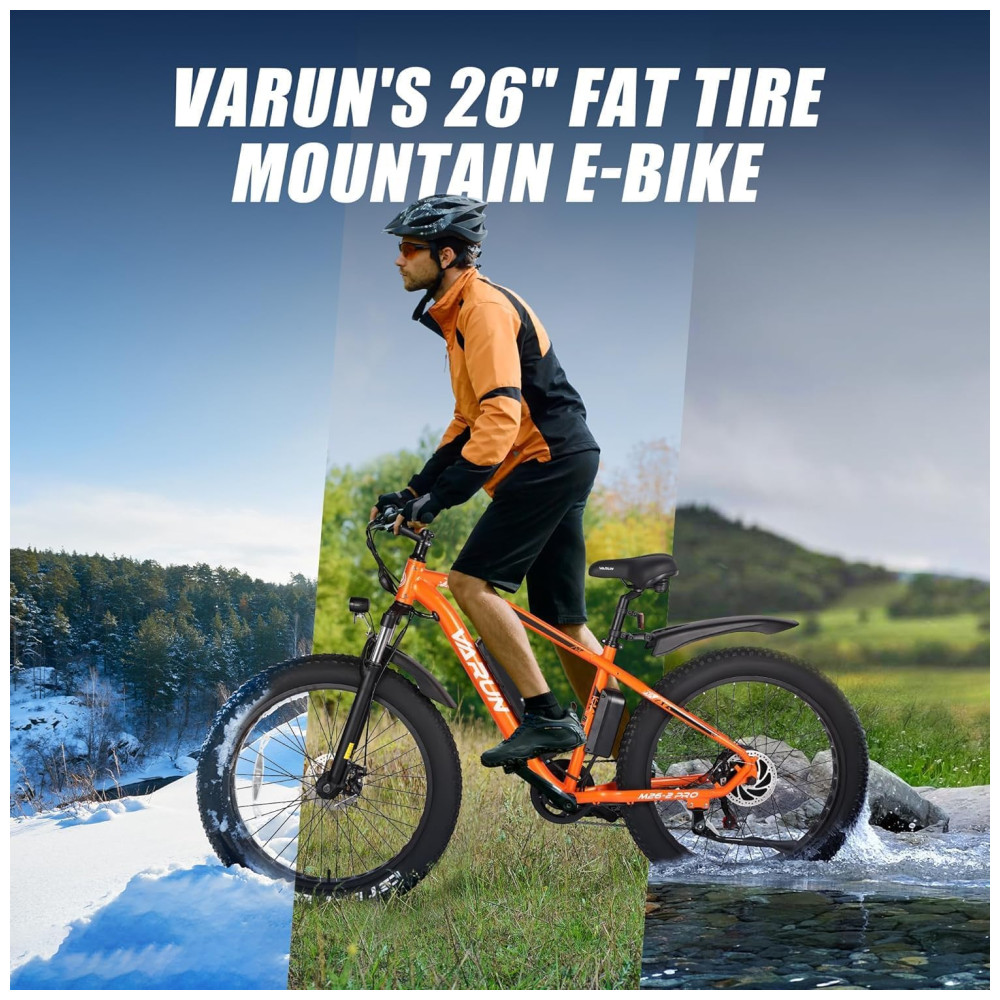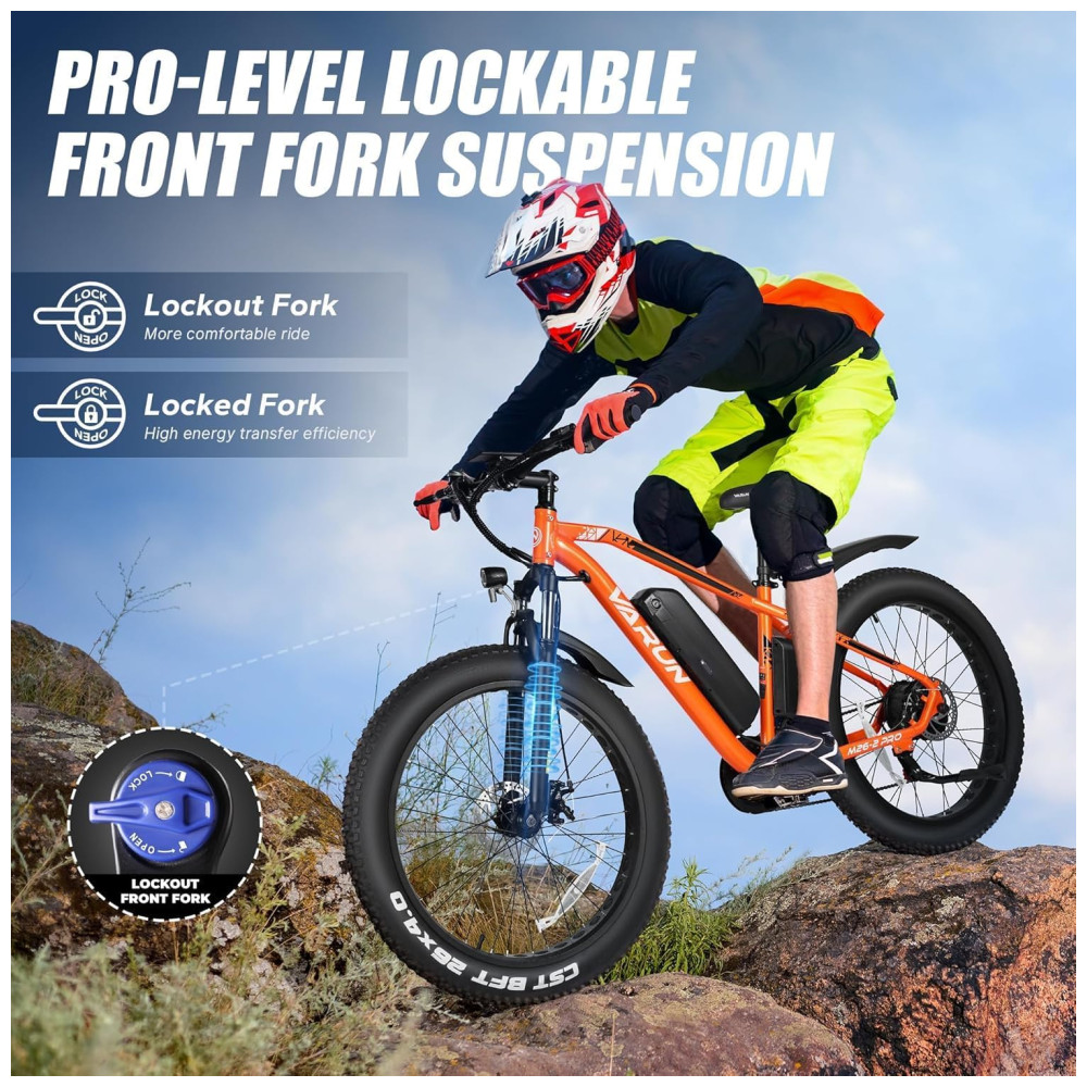 Desperte a aventura com nossa bicicleta elétrica de montanha. Equipada com um motor de 500W (pico de 750W), conquiste montanhas e encostas íngremes a até 40km/h. Escolha entre os modos Pure Electric, Pedal Assist, Walk Assist e Classic Bicycle para sua próxima emoção. Energize seu passeio com a ebike de pneus largos da VARUN. Com uma potente bateria de 48V 13AH, desfrute de até 96km no modo de assistência com proteção BMS. Carregamento rápido em 4-6 horas e opções flexíveis de ligar/desligar garantem aventuras infinitas e seguras. Experimente um conforto superior com a suspensão ajustável da bicicleta elétrica VARUN. Adapte seu passeio a qualquer terreno para um desempenho suave e responsivo em trilhas acidentadas ou ruas da cidade. Eleve sua Maestria Todo-Terreno. Supere paisagens diversas com os pneus grossos de 26″ x 4,0″ resistentes a perfurações, oferecendo aderência e estabilidade superiores em montanhas acidentadas, caminhos nevados, praias de areia e estradas geladas. Desfrute de um passeio suave e confiável onde quer que a vida te leve. Experimente o melhor desempenho com nossa bicicleta elétrica. Com estrutura de alumínio leve, suspensão dianteira bloqueável e freios a disco duplos. Supere subidas com um sistema de 7 velocidades, ande com segurança com faróis LED brilhantes e monitore dados no visor LCD à prova d’água IPX4. Inicie sua aventura facilmente com a bicicleta elétrica para adultos VARUN 90% pré-montada. Desfrute de tranquilidade com garantia de um ano e serviço de atendimento ao cliente dedicado 24 horas. Tem dúvidas? Estamos aqui para garantir que sua experiência com a ebike VARUN seja excepcional.