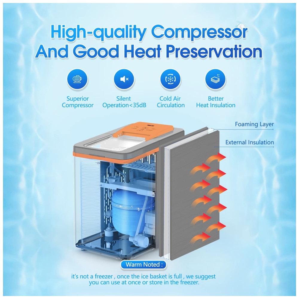 Tecnologia inovadora Sistema de controle simples, mas excelente, fácil de operar. Fazendo cubos de gelo automaticamente após ligar, sem necessidade de babá. O Internal possui o sensor infravermelho mais avançado para evitar o transbordamento de cubos de gelo e a luz indicadora exclusiva para lembrar o usuário de reabastecer a água a tempo. Além disso, a máquina de gelo VECYS possui função de autolimpeza, sendo mais conveniente e sem preocupações