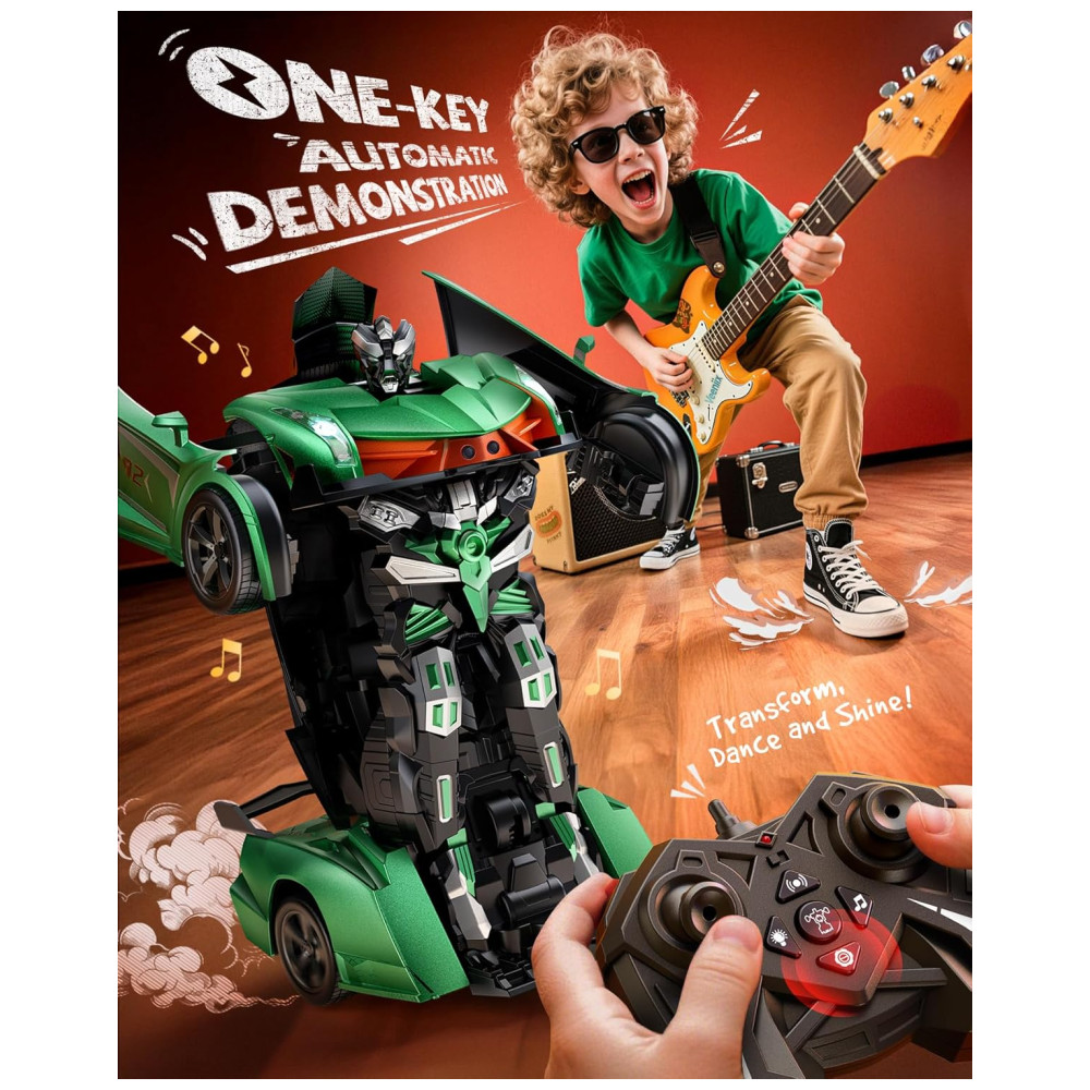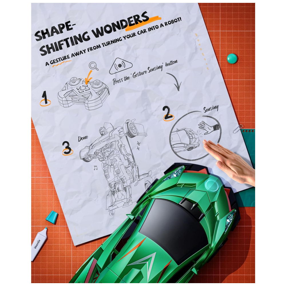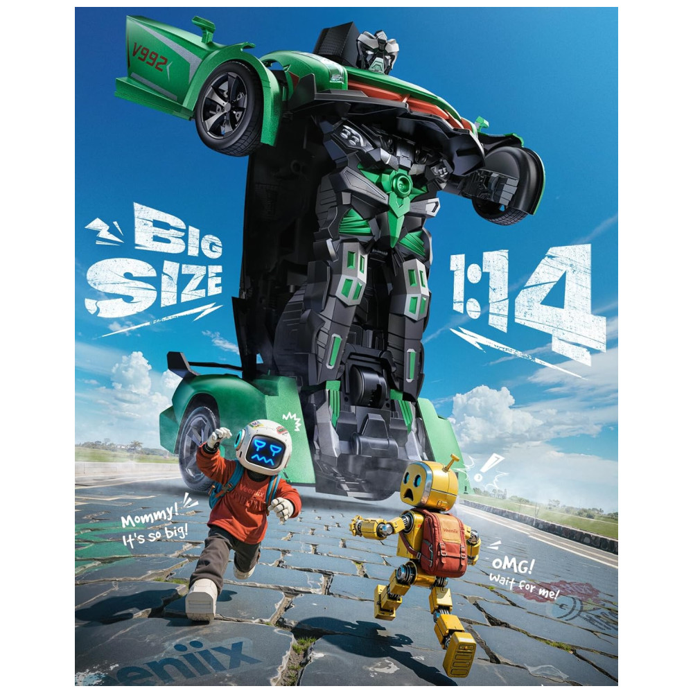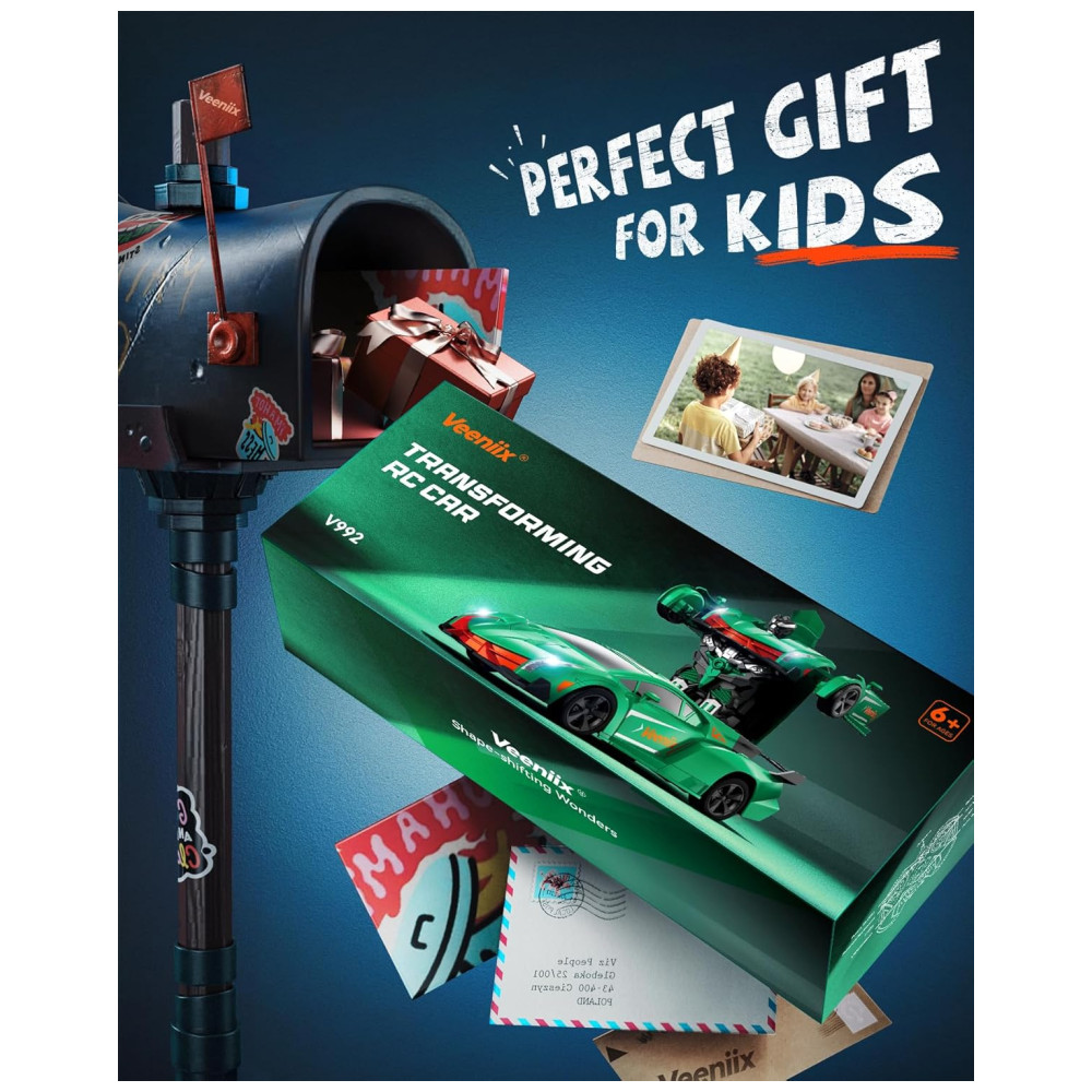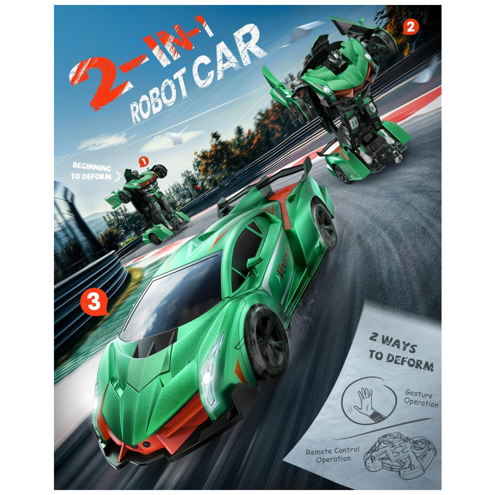 Surpreenda-se com o Veeniix V992 Carro Robô de Controle Remoto Transformável, um brinquedo 2 em 1 que oferece diversão e emoção sem fim para crianças de todas as idades. Experimente a diversão máxima do nosso carro RC transformável, um brinquedo 2 em 1 que oferece duas maneiras de brincar, alternando livremente entre um robô transformável e um carro RC. Esta característica incrível preenche o tempo de brincadeira das crianças com emoção e entretenimento. Corra e transforme-se com os amigos! O controle remoto de 2.4GHz permite que vários carros brinquem juntos sem interferências. Recursos como transformação com um clique, sensor de gestos, modos de demonstração automática, além de música animada e luzes LED, tornam a brincadeira em um show social e interativo! Sem mais espera! O V992 inclui duas baterias recarregáveis de 600mAh com cabos USB, proporcionando até 60 minutos de brincadeira contínua. Troque as baterias enquanto estiver em movimento para que a diversão nunca acabe! Ideal para aniversários, feriados, ou simplesmente porque sim! Seja seu filho apaixonado por robôs, corridas, ou ambos, o V992 oferece emoção e criatividade em uma embalagem elegante e requintada. Presenteie a alegria da transformação hoje!