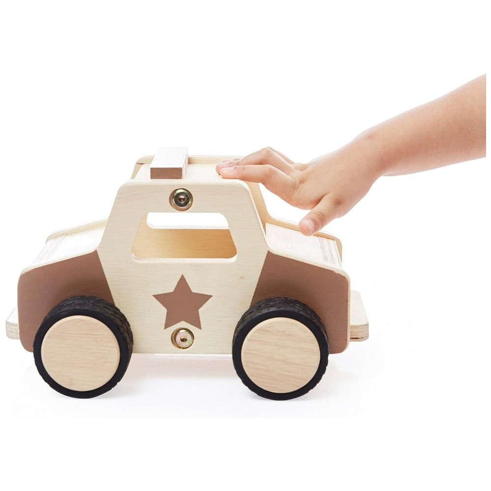 O Guidecraft Wooden Police Car é um veículo de madeira em formato de carro de polícia, indicado para crianças a partir de 2 anos, ideal para complementar cantos de blocos e espaços de brincadeira dramática em casa ou na escola. O brinquedo é produzido em compensado de bétula com ilustrações serigrafadas em tons naturais, e rodas grandes em plástico macio com superfície antiderrapante, que rolam suavemente em diferentes tipos de piso.