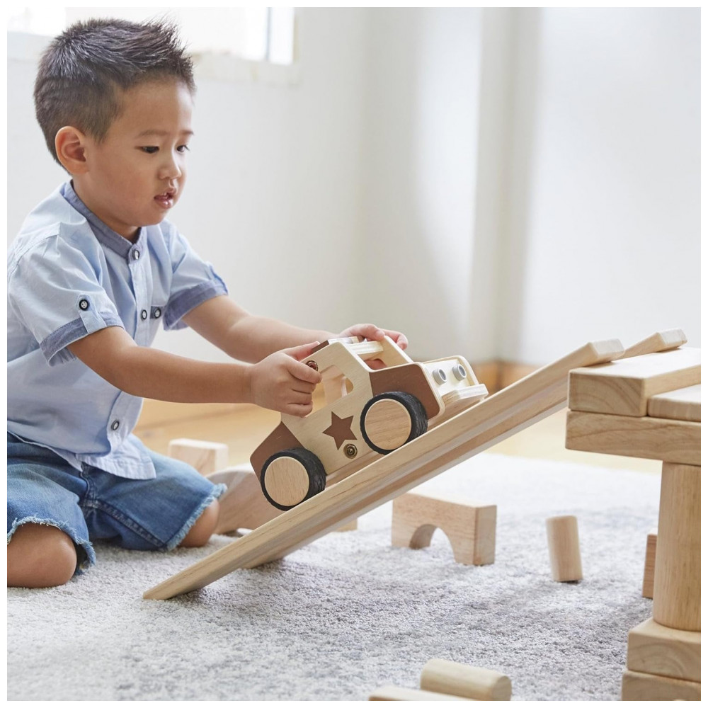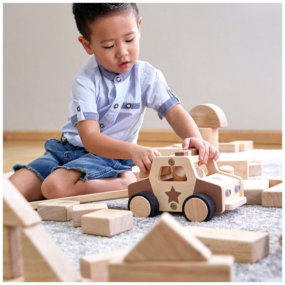 O carro possui corpo robusto, cantos arredondados e dimensões generosas para uso em conjunto com blocos de construção, prédios de cidade de brinquedo e outros elementos de cenários urbanos. Por não utilizar baterias e funcionar apenas de forma manual, favorece o controle direto pela criança, incentivando narrativas de faz de conta sobre trânsito, serviços de emergência e vida em comunidade.