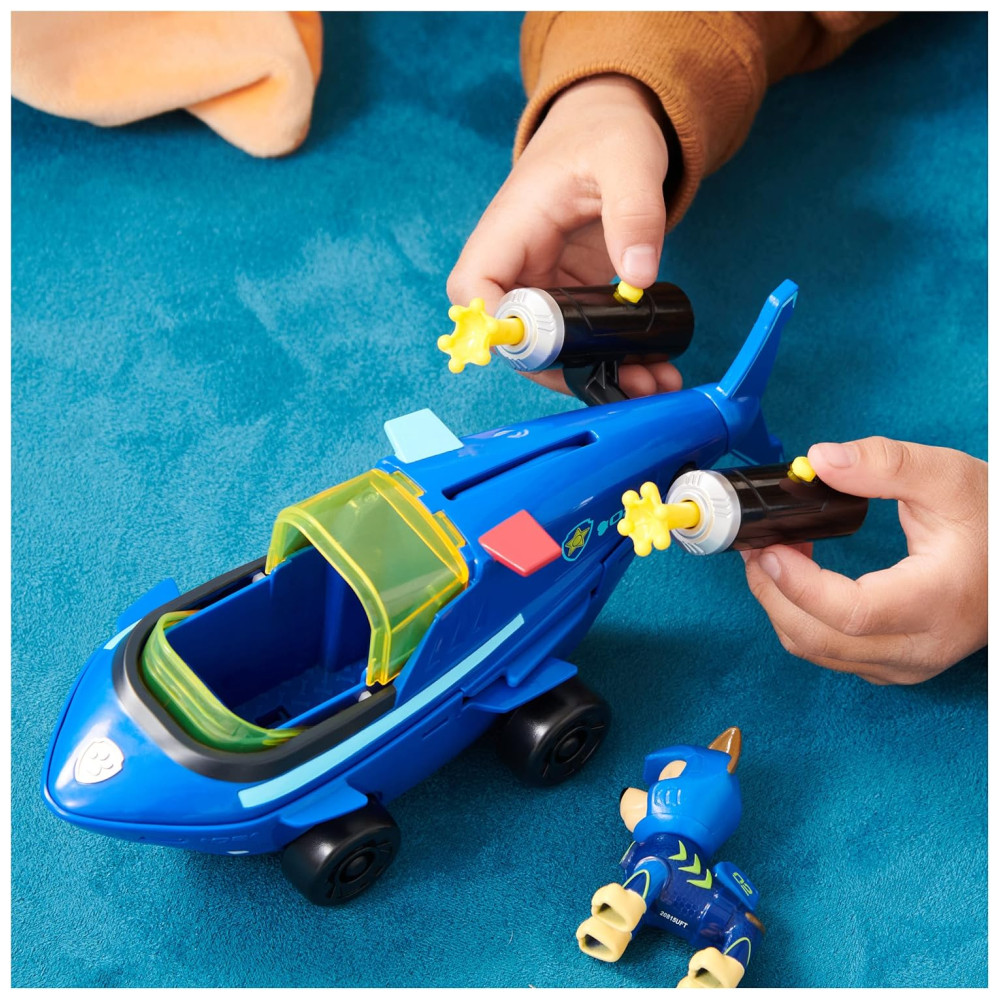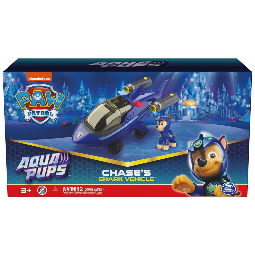Acompanhe Chase em suas missões de resgate no emocionante Aqua Pups Shark Rescue Vehicle Com sua roupa de mergulho e capacete azul, Chase está pronto para enfrentar qualquer desafio no mar. O veículo apresenta uma transformação incrível basta colocar Chase na cabine e fechar a capota para ativar as asas e nadadeira dorsal, transformando o em modo de resgate. Além disso, o veículo possui lançadores para os dois projéteis incluídos, que podem ser disparados pressionando os botões.