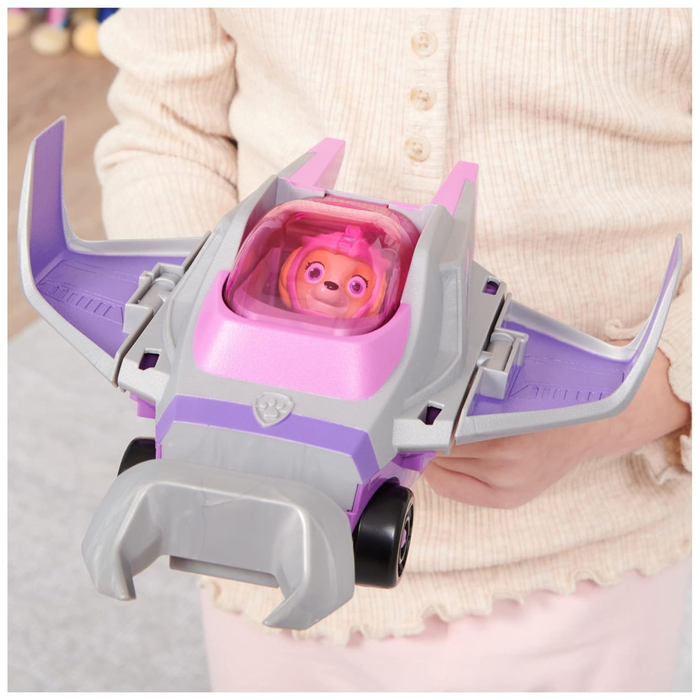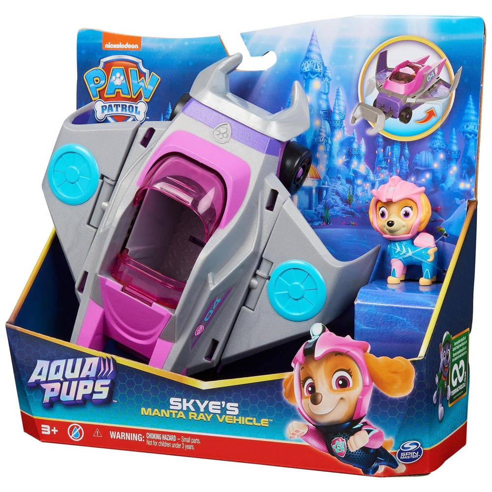 Junte se a Skye em suas missões de resgate no mar de mentira com o veículo de resgate Aqua Pups Manta Ray. Com seu traje de mergulho e capacete rosa, Skye está pronta para aventuras emocionantes. O veículo apresenta uma transformação empolgante, basta colocar Skye na cabine e fechar a capota para ativar as ações de giro da asa e buzina, transformando o em modo de resgate.