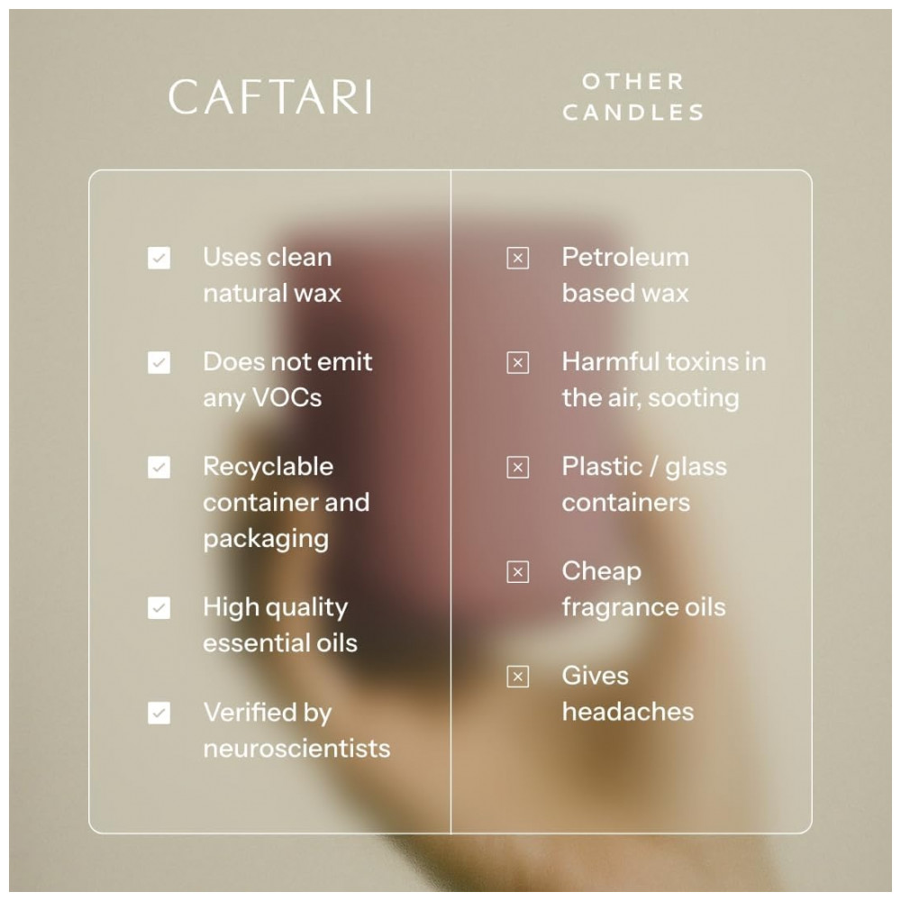 A fragrância terrosa e meditativa da Vela de Aromaterapia de Luxo CAFTARI é uma mistura exclusiva de oudh, cedro suave e incenso esfumaçado, criando um aroma resinoso sereno, calmante e complexo. Projetada para centralizar seu espaço com uma profundidade tranquila e ritualística que permanece no ar. Com tempo de queima estendido e limpo, feita com uma combinação premium de cera de coco e soja e pavio de algodão natural, esta vela de 10,5 oz queima suavemente por até 60 horas, fornecendo uma fragrância consistente e uniforme que preenche o ambiente sem sobrecarregá-lo. Formulada sem parabenos, ftalatos ou corantes sintéticos, a Vela de Aromaterapia de Luxo CAFTARI é vegana e livre de crueldade, oferecendo uma indulgência consciente, pura, polida e feita para aqueles que valorizam o luxo moderno e limpo. Com design minimalista e toque artesanal, despejada em um recipiente cerâmico fosco, cada vela é um exemplo de elegância discreta. O formato elegante e a paleta neutra a tornam um acessório versátil para interiores refinados e espaços cuidadosamente elaborados. De sua fragrância elevada à sua embalagem moderna, a Vela de Aromaterapia de Luxo CAFTARI é um presente excepcional para aniversários, inaugurações ou rituais de bem-estar, oferecendo uma expressão radiante de estilo, cuidado e intenção.