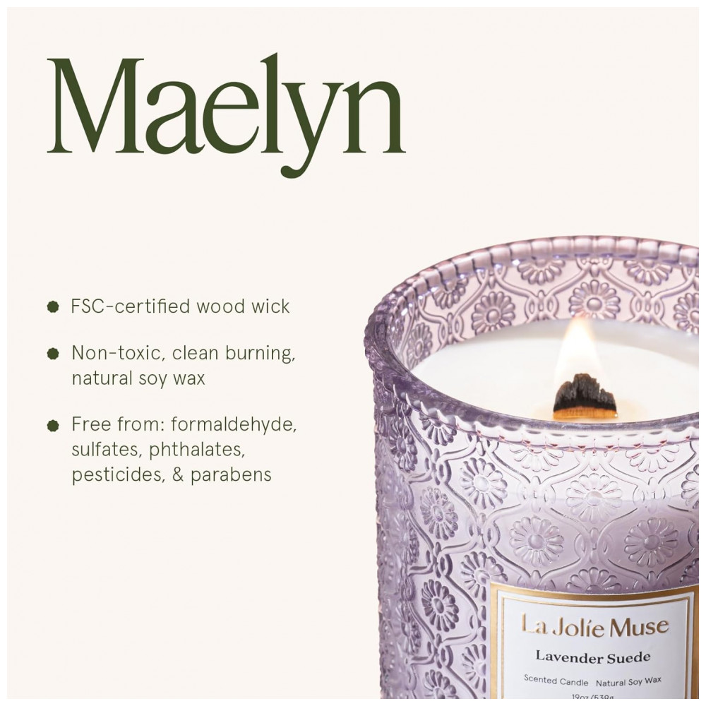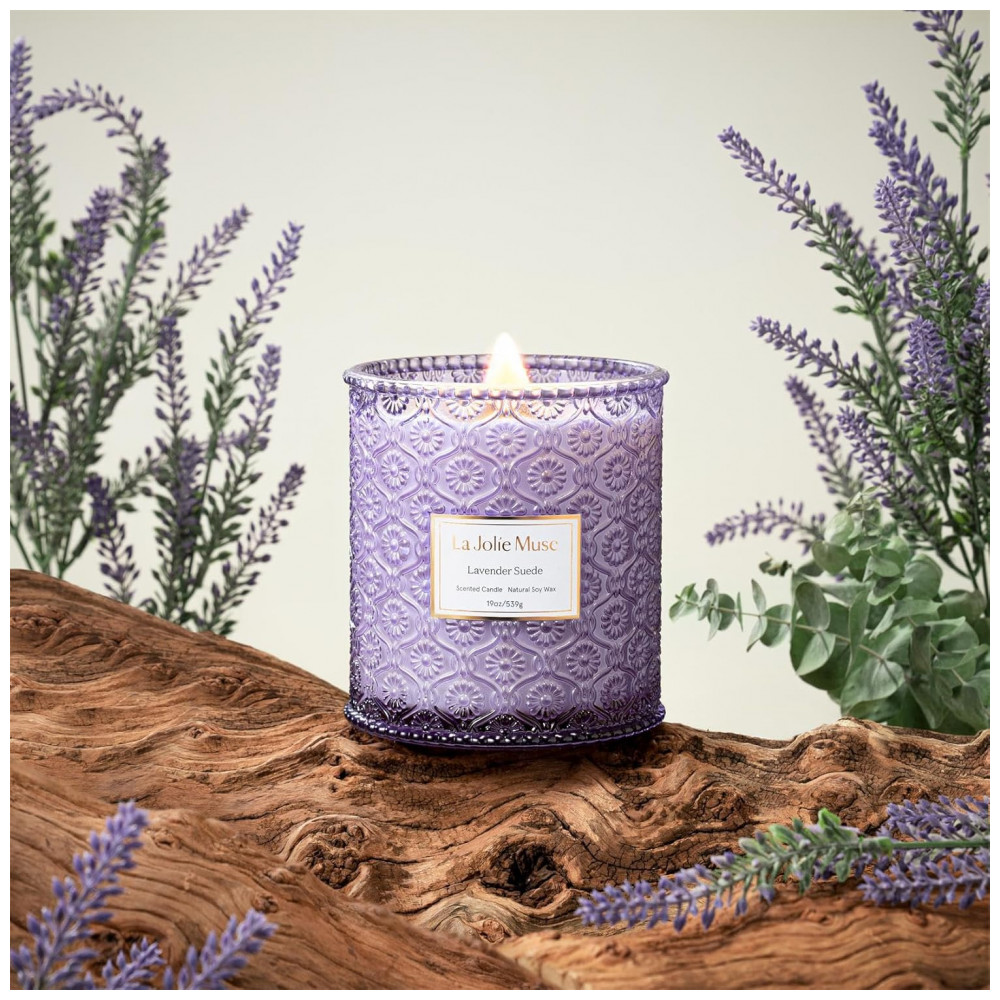 Vela de Lavanda e Camurça LA JOLIE MUSE Eucalipto Lavanda e Sândalo 539g com Pavio de Madeira – Cera de Soja Natural – 90 Horas de Queima Limpa – Aro