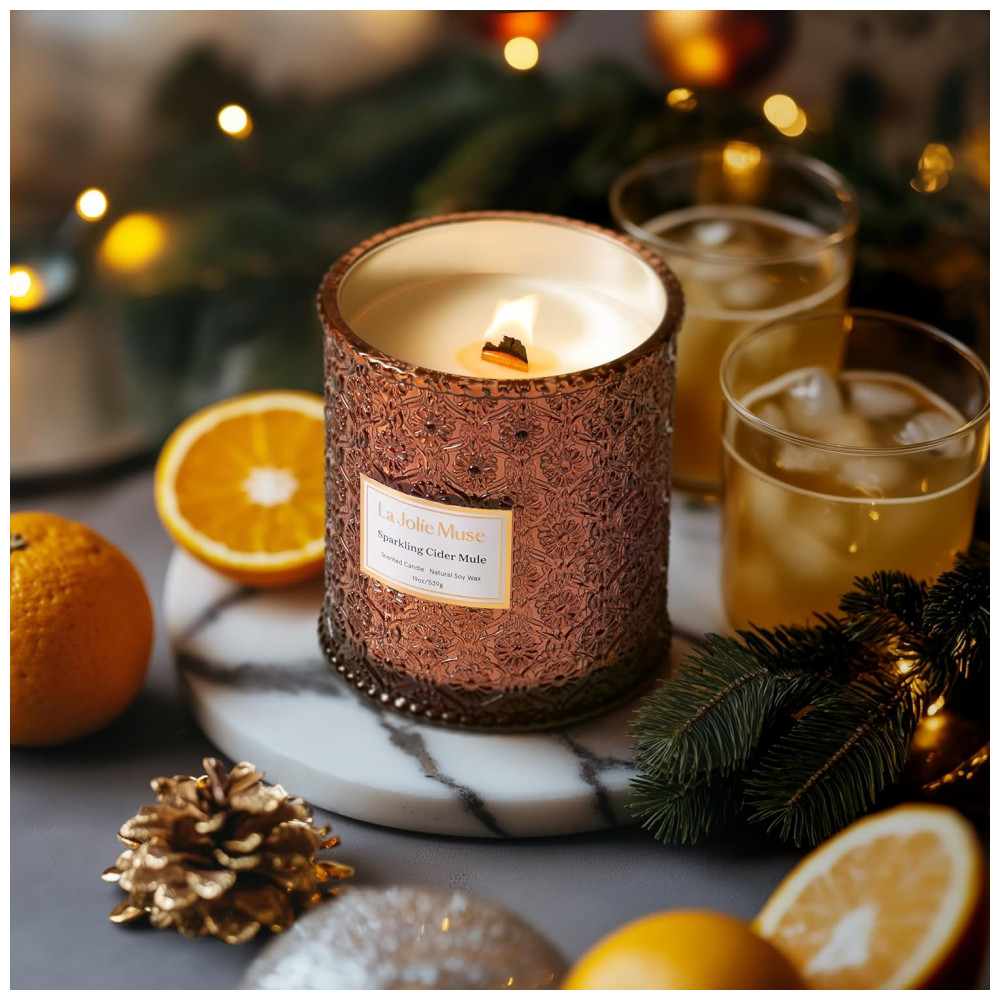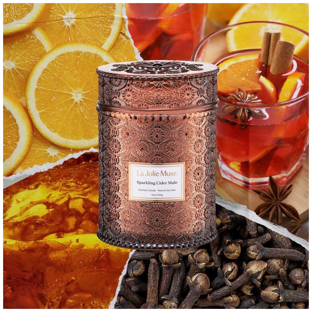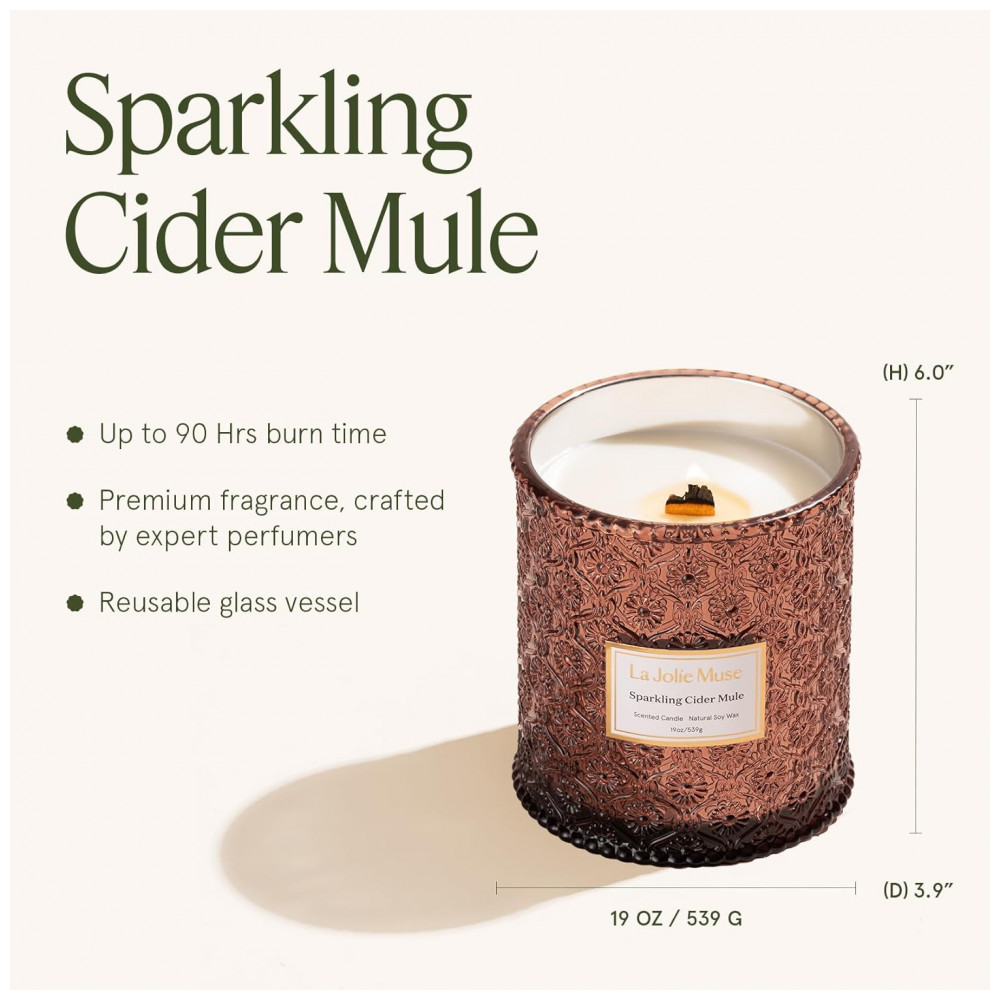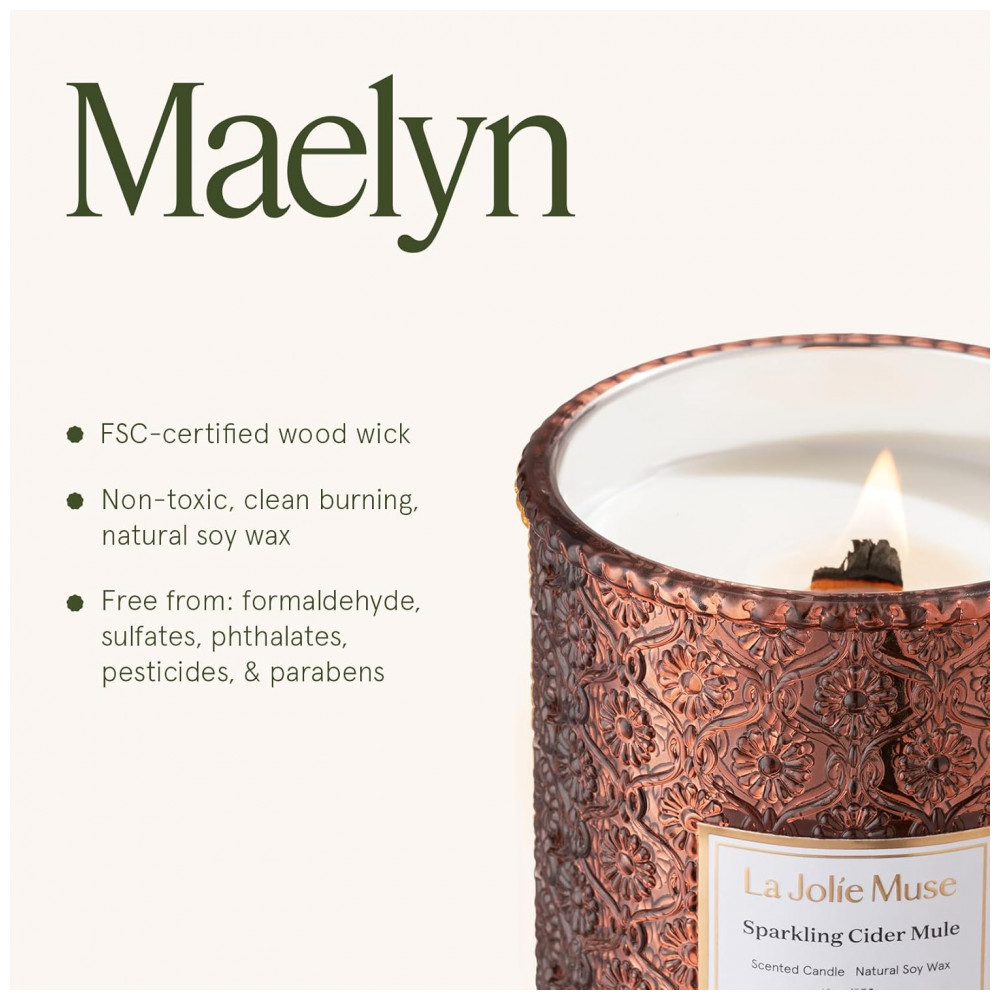 A Coleção Maelyn apresenta velas de luxo inspiradas em jardins antigos e propriedades europeias. Decoradas com motivos de margarida, cada frasco combina elegância na decoração com aconchego nostálgico e atmosfera sazonal. A vela Sparkling Cider Mule é uma mistura festiva de laranja, cereja e noz-moscada, com um coração de cidra temperada, cravo e canela, finalizada com baunilha quente, cedro e âmbar – perfeita para brunches de outono, brindes e encontros aconchegantes. Ingredientes Limpos, feitos com cera de soja vegana e pavio de madeira de cerejeira, garantem uma queima limpa e uniforme, com mínima fuligem. Nossas velas perfumadas são livres de formaldeído, sulfatos, ftalatos, pesticidas e parabenos para seu desfrute sem preocupações. Tamanho e Tempo de Queima de Luxo frasco de vidro reutilizável de 540g, com até 90 horas de queima limpa, perfeito para mesas festivas, cestas de presentes ou para receber visitas. Para melhores resultados, queime por 4 horas na primeira utilização e apare o pavio para 46 mm após cada queima. Embalagem Pronta para Presente, elegantemente embalada com fita para presentear com facilidade. Despejada em um frasco de vidro reutilizável com interior metálico reluzente que realça o brilho quente. Ideal para a temporada de cidra e amantes de coquetéis.