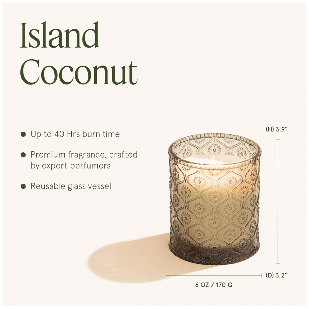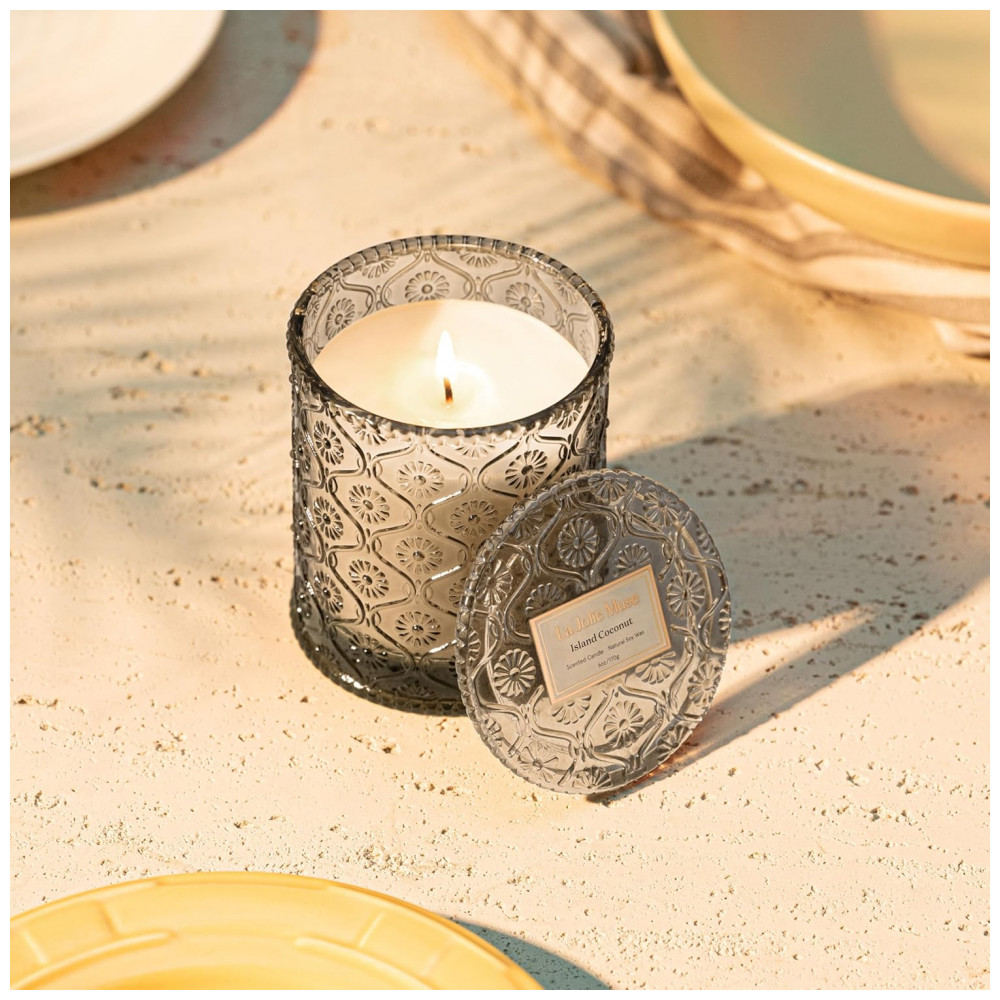 A Vela Decorativa LA JOLIE MUSE é despejada em um frasco de vidro luxuoso, com padrões gravados de margaridas, tornando-se uma peça decorativa marcante. Após queimar a vela, o frasco pode ser reutilizado como um belo vaso de flores, porta-pincéis, pote de armazenamento, etc. Desfrute de uma escapada tropical com o aroma de coco, pêssego e baunilha, envolvidos pela combinação calorosa de cumaru e sândalo, finalizados com um toque doce de fava de baunilha. Embalada em uma caixa com design exclusivo e detalhes em ouro, esta vela é o presente perfeito para diversas ocasiões. Quando acesa, a fragrância se difunde rapidamente, preenchendo instantaneamente o ambiente com um aroma revigorante. Feita com cera natural e pavio de algodão isento de chumbo, garante uma queima limpa e uniforme por 40 horas, sendo cruelty-free e livre de conservantes.