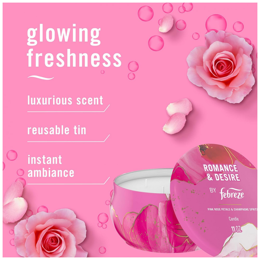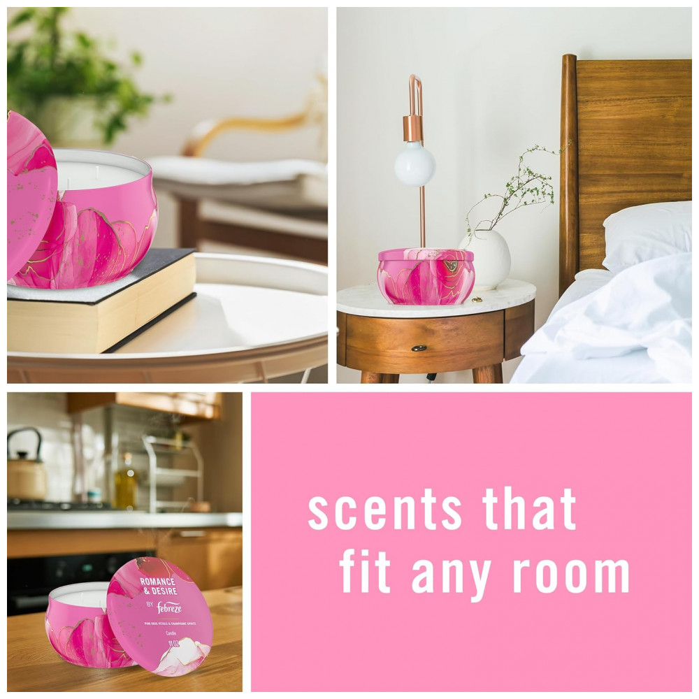 Quem disse que a noite de encontros não pode ser todos os dias? Com a Vela Febreze Romance Desejado, você pode encontrar sua faísca graças aos toques de champanhe borbulhante e pétalas de rosa rosa. Você estará diminuindo as luzes e aumentando a paixão em pouco tempo. Coloque em seus lugares favoritos como quartos, salas de estar, banheiros ou cantinhos aconchegantes. Adicione uma fragrância fresca em toda a casa onde quer que o clima te atinja. Fragrância Agradável adiciona um aroma agradável a qualquer ambiente sem ser avassalador. Combata odores persistentes no ar com esta adorável vela perfumada.