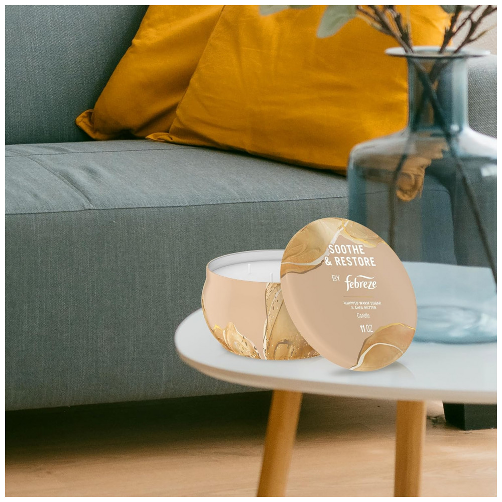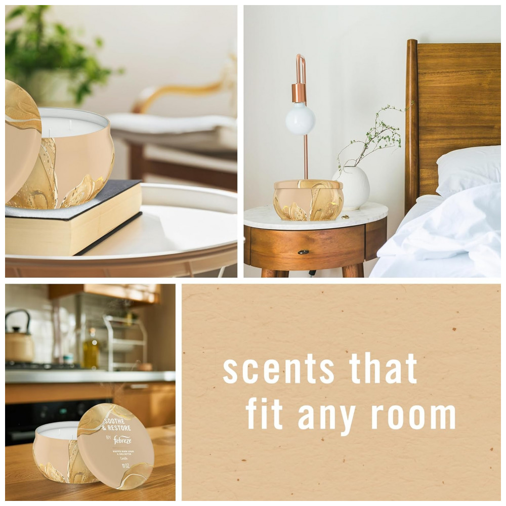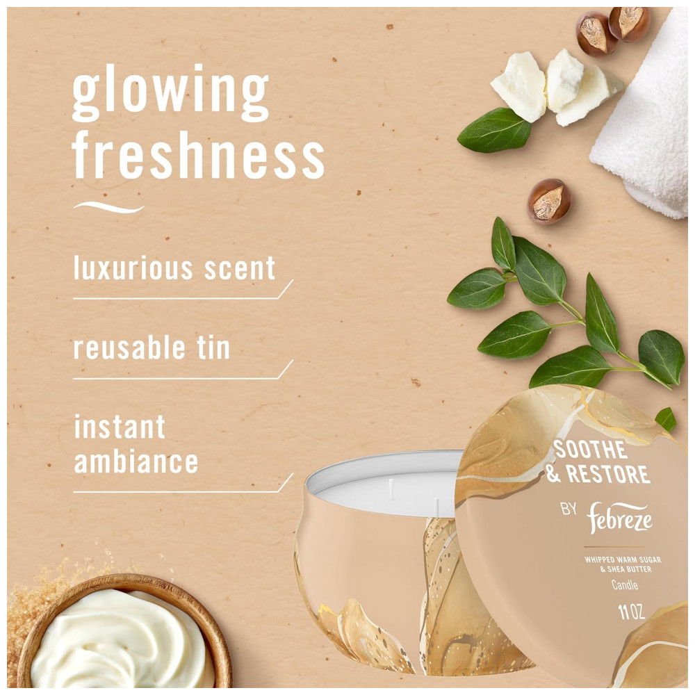 Aconchego, conforto, relaxamento. A Vela Febreze Soothe Restore é TUDO isso e muito mais. A fragrância de manteiga de karité combinada com o toque delicado de açúcar quente batido transformará qualquer espaço em um reino de maravilhas emocionantes para onde você pode escapar. Ideal para ambientes como quartos, salas de estar, banheiros ou cantinhos aconchegantes. Adicione uma fragrância fresca em toda a casa onde quer que o humor te leve. Perfume Agradável que adiciona uma fragrância agradável a qualquer ambiente sem ser avassalador. Combate odores persistentes no ar com esta encantadora vela perfumada.