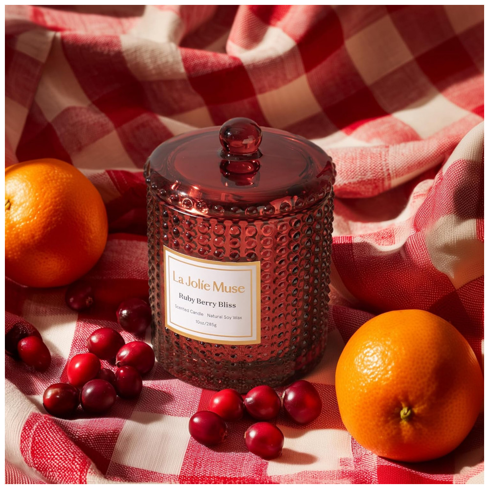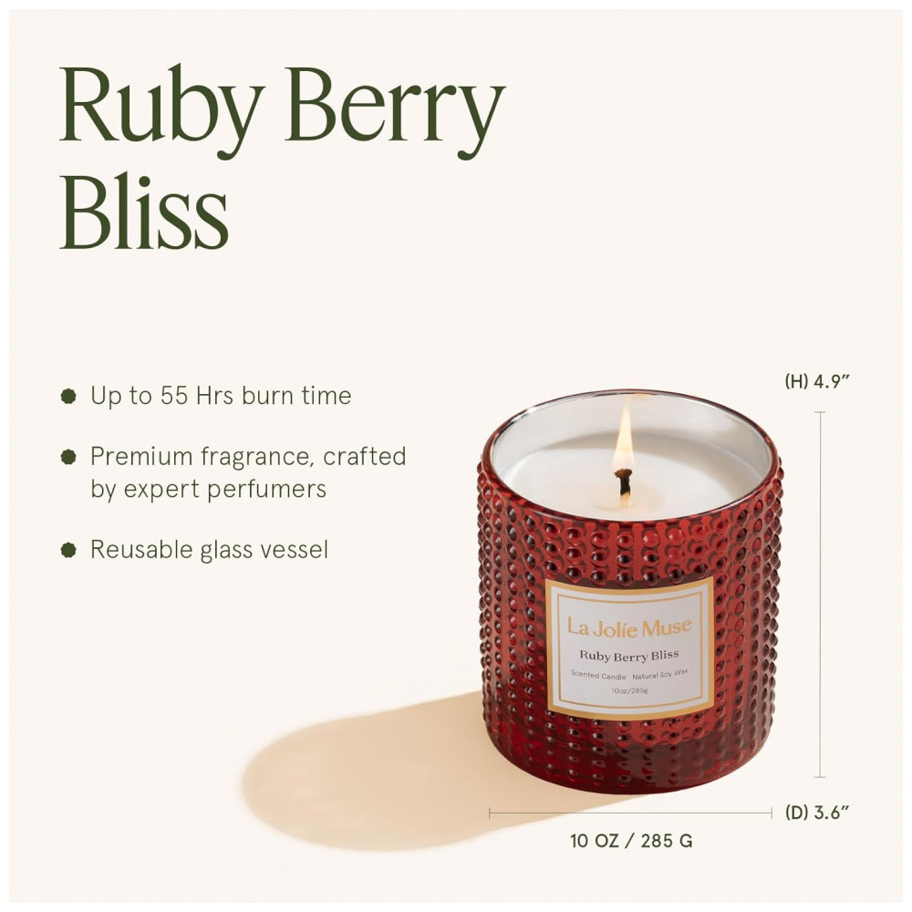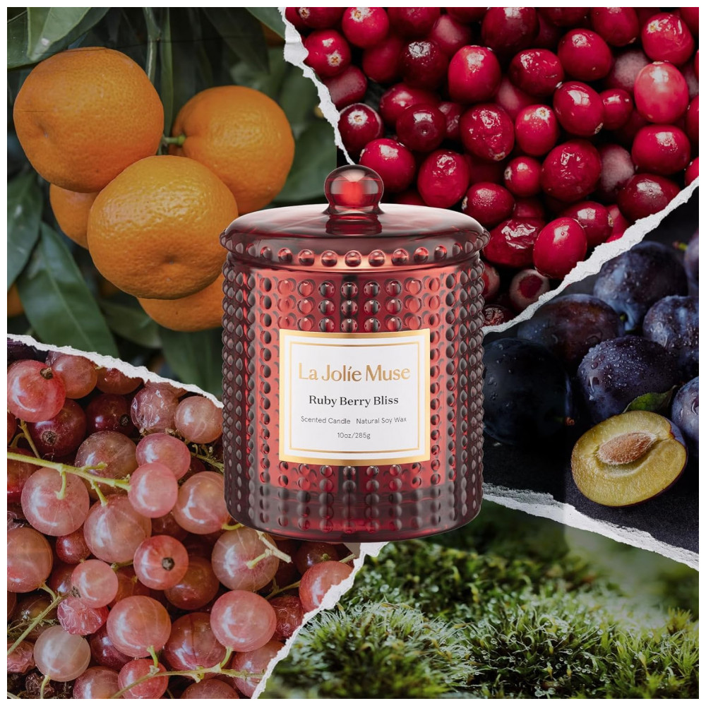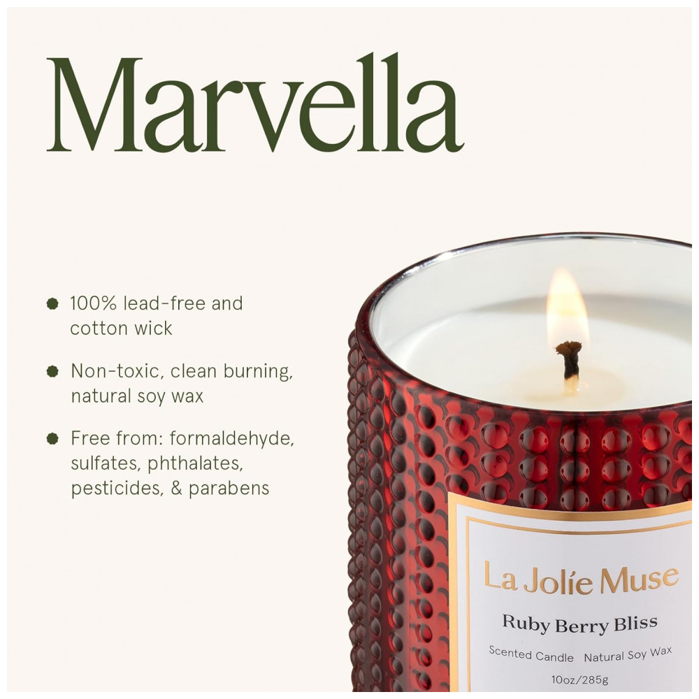 Celebre a elegância vibrante e o charme sofisticado com a Coleção Marvella da LA JOLIE MUSE. Cada frasco de vidro de alta qualidade, inspirado em estéticas clássicas e contemporâneas, apresenta um padrão distintivo que cria um jogo dinâmico de luz e sombra quando acesa. A Vela Perfumada Ruby Berry Bliss combina mandarina, laranja e grapefruit com cranberry, groselha e rosa, finalizando com ameixa e musgo de carvalho. Esta vela perfumada de frutas traz o calor, a celebração e o charme festivo das festas. Feita com cera de soja vegana e pavio de algodão sem chumbo para queima limpa e uniforme, com mínimo de fuligem. Livre de formaldeído, sulfatos, ftalatos, pesticidas e parabenos. Frasco de vidro reutilizável de 283g, que queima limpo por até 55 horas, ideal para relaxamento, noites aconchegantes ou autocuidado. Embalagem pronta para presente, ideal para presentear anfitriões, amigos, família ou a si mesmo.