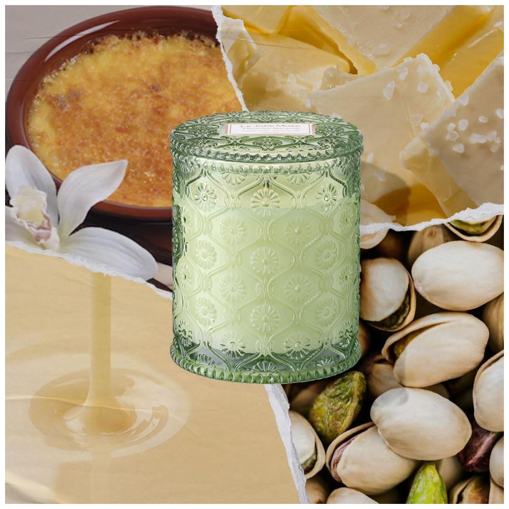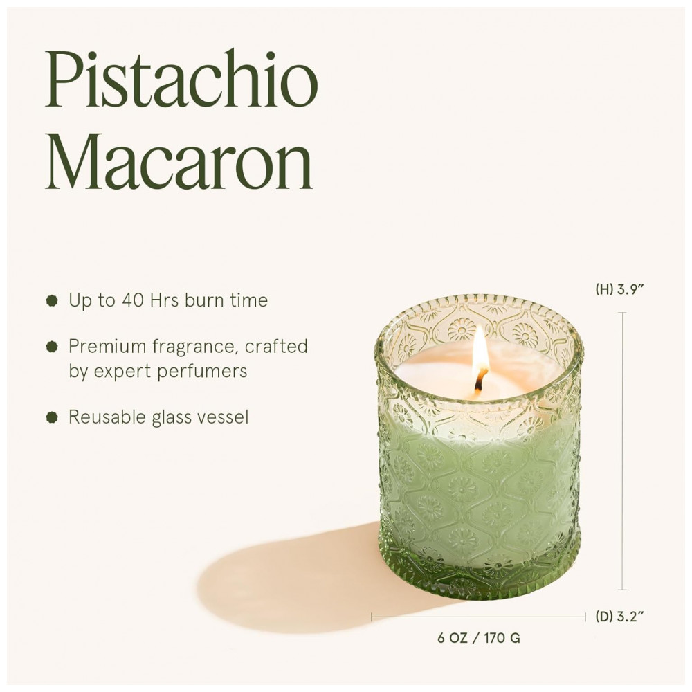 A Coleção Maelyn apresenta velas de luxo inspiradas em jardins antigos e mansões europeias. Cada frasco, adornado com motivos de margaridas, combina elegância na decoração com uma calorosa e nostálgica ambientação sazonal. O aroma de Pistache Macaron é uma deliciosa mistura de pistache, flor de laranjeira e manteiga, com um coração de leite condensado, lírio do vale e violeta, finalizado com uma base de baunilha caramelizada, fava tonka e praliné – perfeito para os amantes de doces. Ingredientes Limpos feitos com cera de soja vegana e pavio de algodão sem chumbo para uma queima limpa e uniforme, com mínima fuligem. Livres de formaldeído, sulfatos, ftalatos, pesticidas e parabenos. Tamanho e Tempo de Queima frasco de vidro de 170g, queima limpa por até 40 horas – perfeito para cantinhos aconchegantes, dias de culinária, rotinas de autocuidado ou para criar um lar acolhedor. Para melhores resultados, queime por 4 horas na primeira utilização e apare o pavio para 4-6 mm após cada queima. Embalagem Pronta para Presente embalada em materiais recicláveis com um frasco de vidro reutilizável para elevar sua casa e o planeta. Um presente encantador para amantes de sobremesas, padeiros e para quem acredita que a vida fica melhor com um mimo.