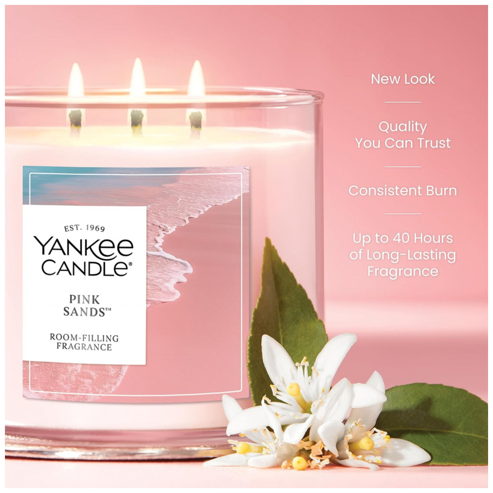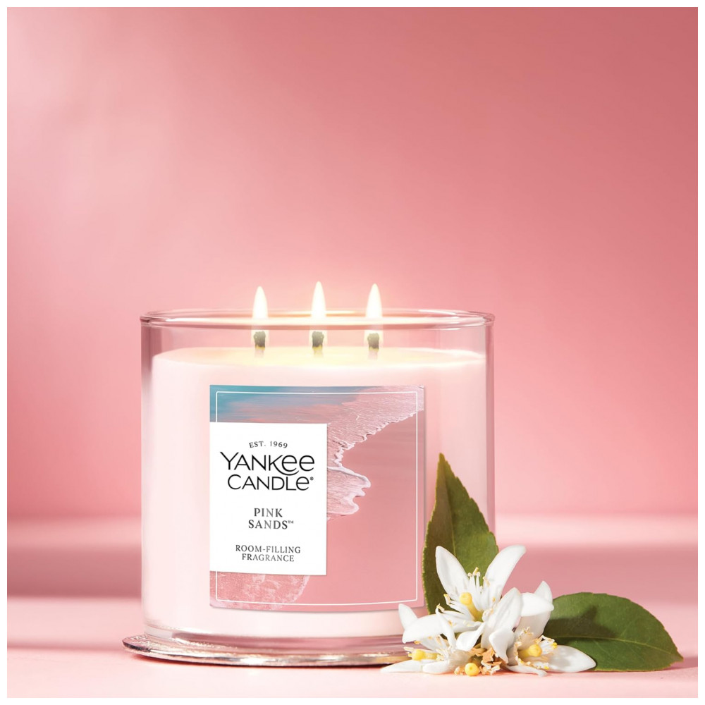 Nossas Velas de 3 Pavios são feitas com uma mistura premium de cera vegetal e três pavios de fibra natural para uma dispersão aprimorada, desempenho de fragrância ideal e ambiente definitivamente aconchegante. Com 411g, são do tamanho perfeito para presentear e ainda oferecem até 40 horas de fragrância envolvente. Pink Sands é o escape para uma ilha exótica que você sempre sonhou. Aromas suculentos de melão são suavizados por suaves notas de osmanthus, proporcionando-lhe espaço para relaxar e clarear a mente. Notas de base quentes, enriquecidas por um toque de jasmim, completam a sensação de paraíso. Feita com uma mistura premium de cera vegetal e três pavios de fibra natural para um desempenho ideal de fragrância. Fragrância consistente e duradoura do primeiro ao último uso. Vela de longa duração com até 40 horas de fragrância envolvente. Tampa metálica decorativa protege a cera do acúmulo de poeira e detritos entre as queimas. Qualidade em que você pode confiar. Fabricada nos EUA com materiais de origem global.