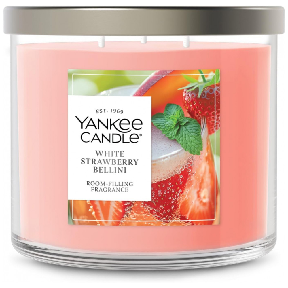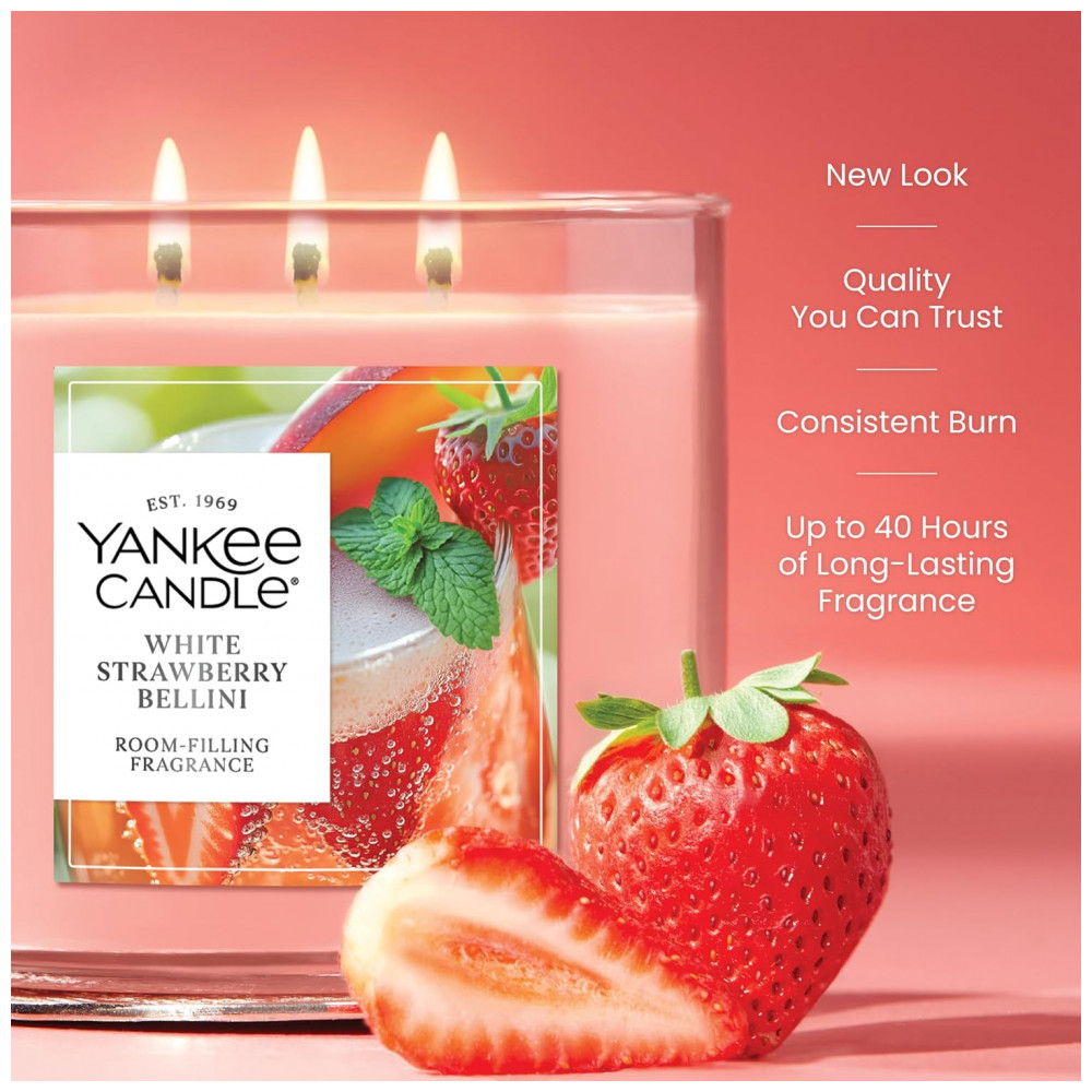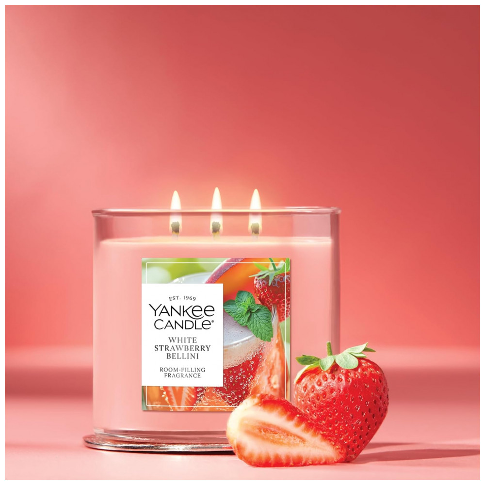 Nossas velas de 3 pavios são feitas com uma mistura premium de cera vegetal e três pavios de fibra natural para uma dispersão aprimorada do perfume, desempenho de fragrância ideal e ambiente final. Com 14,5 oz, são do tamanho perfeito para presentear e ainda fornecem até 40 horas de fragrância que preenche o ambiente. White Strawberry Bellini: Conversas envolventes encontram drinks deliciosos no brunch com o melhor dos melhores. O aroma de vinho espumante, enfeitado com morangos e um pêssego fatiado, te revigora tanto quanto seus companheiros. Feita com uma mistura premium de cera vegetal e três pavios de fibra natural para desempenho de fragrância ideal. Fragrância consistente e duradoura da primeira à última queima. Vela de longa duração com até 40 horas de fragrância que preenche o ambiente. Tampa de metal decorativa protege a cera do acúmulo de poeira entre as queimas. Qualidade em que você pode confiar. Fabricada nos EUA com materiais de origem global.