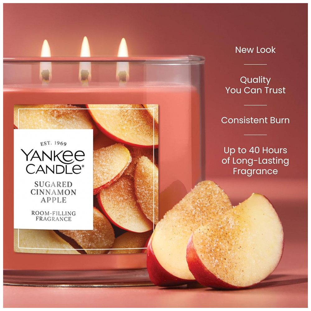 Nossas Velas 3 Pavios são feitas com uma mistura premium de cera vegetal e três pavios de fibra natural para uma dispersão aprimorada, desempenho de fragrância ideal e ambiente definitivo. Com 14,5 oz, são o tamanho perfeito para presentear e ainda fornecem até 40 horas de fragrância envolvente. Maçã Canela Açucarada: o delicioso aroma de fatias de maçã crocantes açucaradas com canela e baunilha. Esta fragrância doce e picante vai te fazer desejar as frutas do outono ou uma grande caneca de cidra. Feita com uma mistura premium de cera vegetal e três pavios de fibra natural para um desempenho de fragrância ideal. Fragrância consistente e duradoura do primeiro ao último uso. Vela de longa queima com até 40 horas de fragrância envolvente. Tampa metálica decorativa protege a cera do acúmulo de poeira entre as queimas. Qualidade em que você pode confiar. Fabricada nos EUA com materiais de origem global.