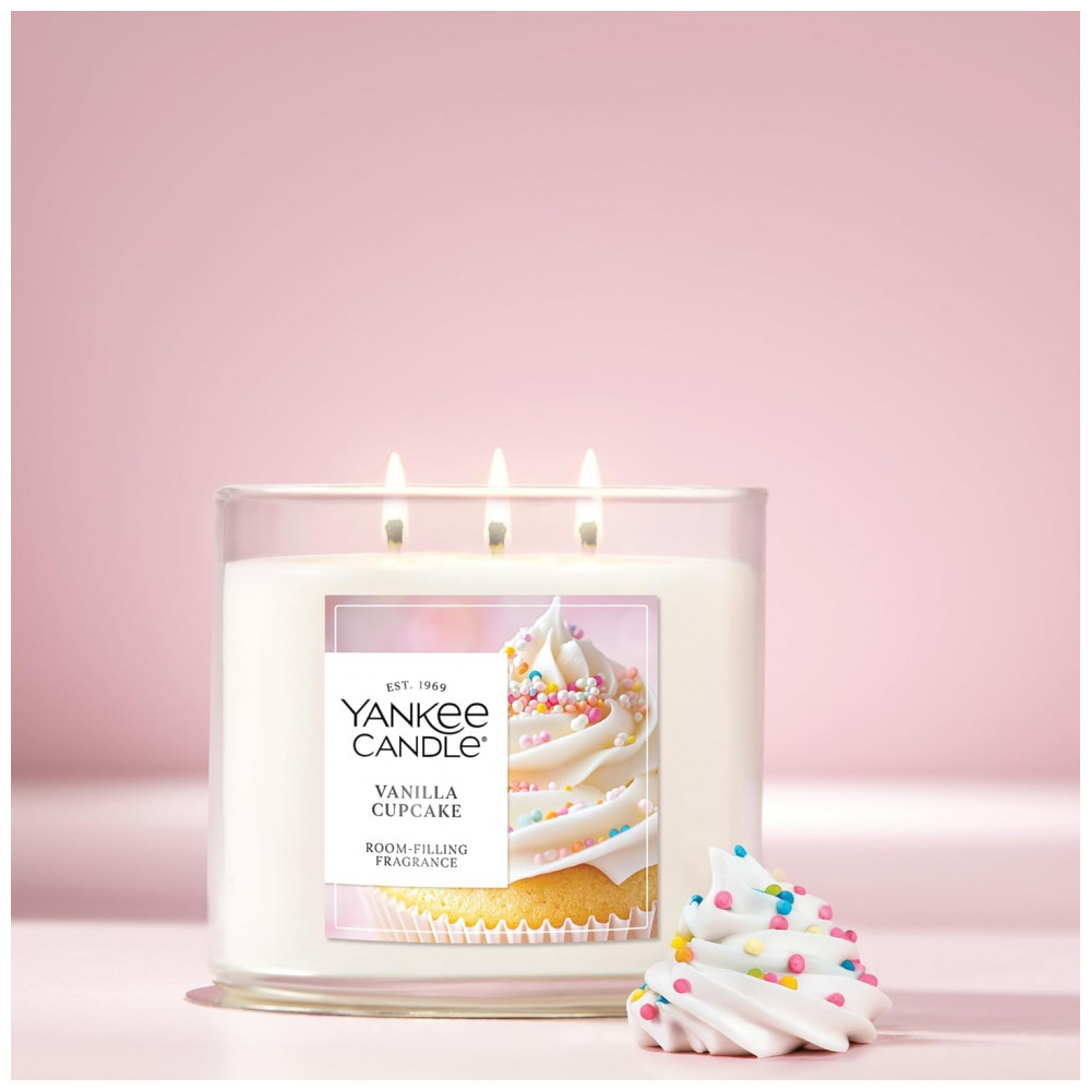 Nossas Velas de 3 Pavios são feitas com uma mistura premium de cera vegetal e três pavios de fibra natural para uma dispersão aprimorada, desempenho de fragrância ideal e ambiente final. Com 411g, são do tamanho perfeito para presentear e ainda oferecem até 40 horas de fragrância envolvente. Baunilha Cupcake Um dia de cozimento termina com a alegria de cupcakes recém-decorados. O aroma de massa de bolo úmida coberta com glacê de baunilha cremoso e açúcar maltado é tão perfeitamente doce que você não consegue resistir à ideia. Feita com uma mistura premium de cera vegetal e três pavios de fibra natural para desempenho ideal de fragrância. Fragrância duradoura e coerente do primeiro ao último uso. Vela de longa duração com até 40 horas de fragrância envolvente. Tampa metálica decorativa protege a cera do acúmulo de poeira entre as queimas. Qualidade em que você pode confiar. Fabricada nos EUA com materiais de origem global.
