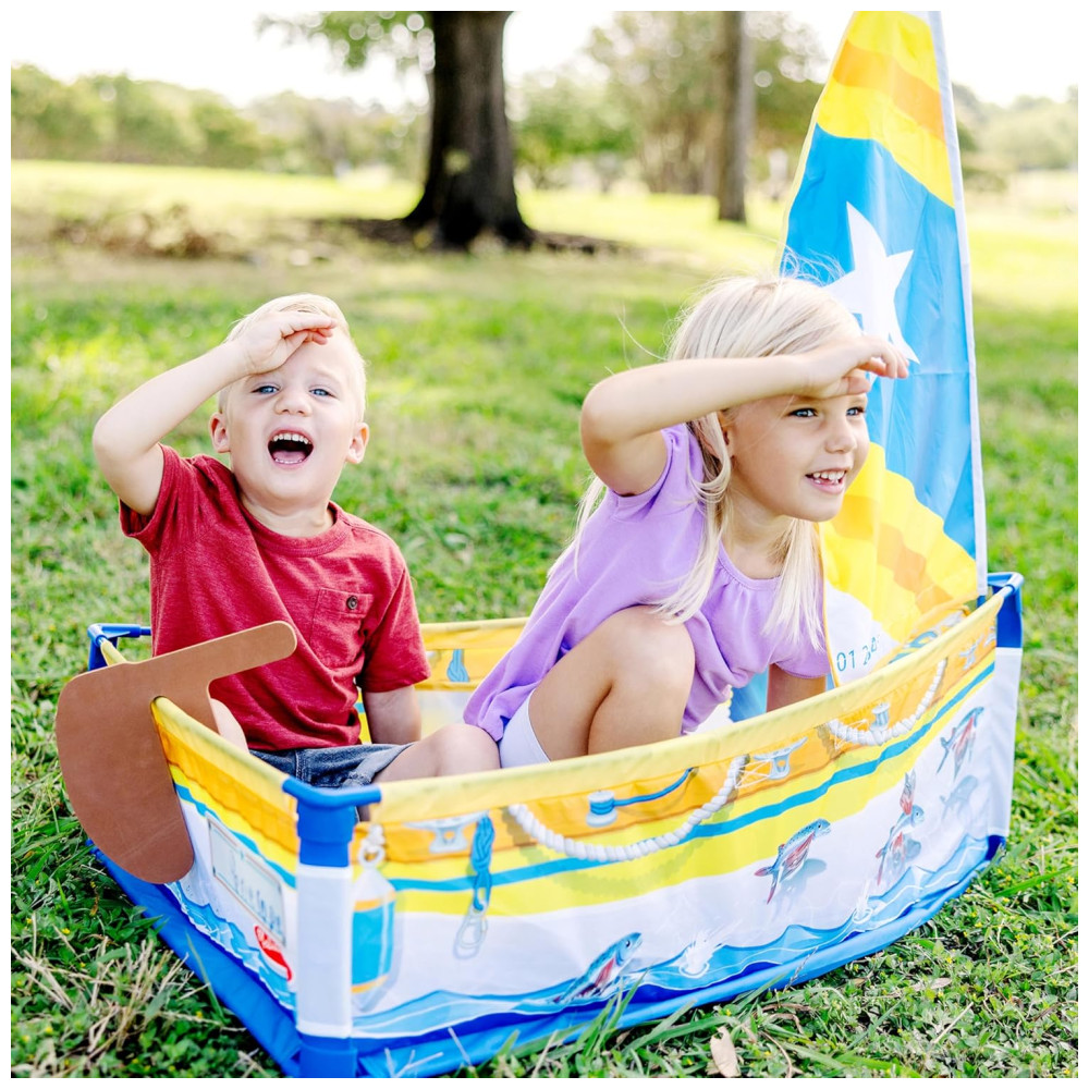 Explore aventuras de simulação de barco com este conjunto resistente de tecido para veleiro. Ideal para crianças acima de 3 anos, o conjunto inclui um leme e uma âncora de espuma, além de uma placa removível e reutilizável para nomear a embarcação. O barco montado tem aproximadamente 0,91 metros de altura, 0,91 metros de comprimento e 0,61 metros de largura, oferecendo muito espaço para várias crianças brincarem juntas.