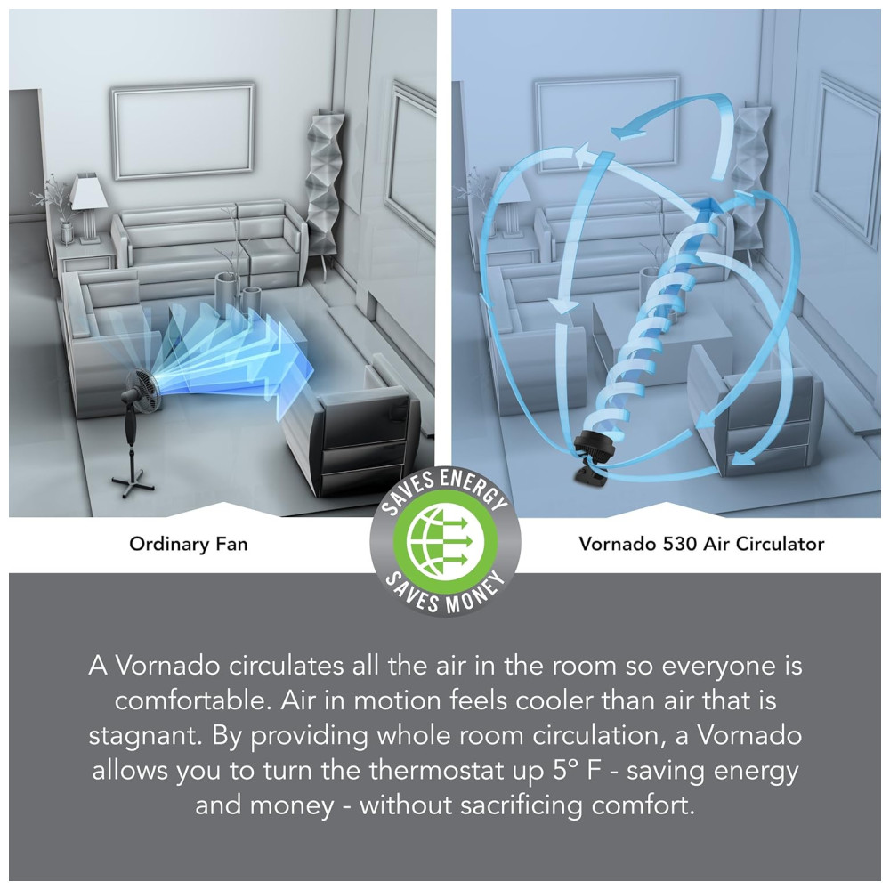 Conheça o Vornado 530 Circulador de Ar Compacto para Todo o Ambiente, um ventilador que utiliza a exclusiva tecnologia de circulação de ar Vortex para mover o ar de maneira eficaz por todo o cômodo. Não importa onde você esteja na sala, você sentirá a potência de um ventilador Vornado.