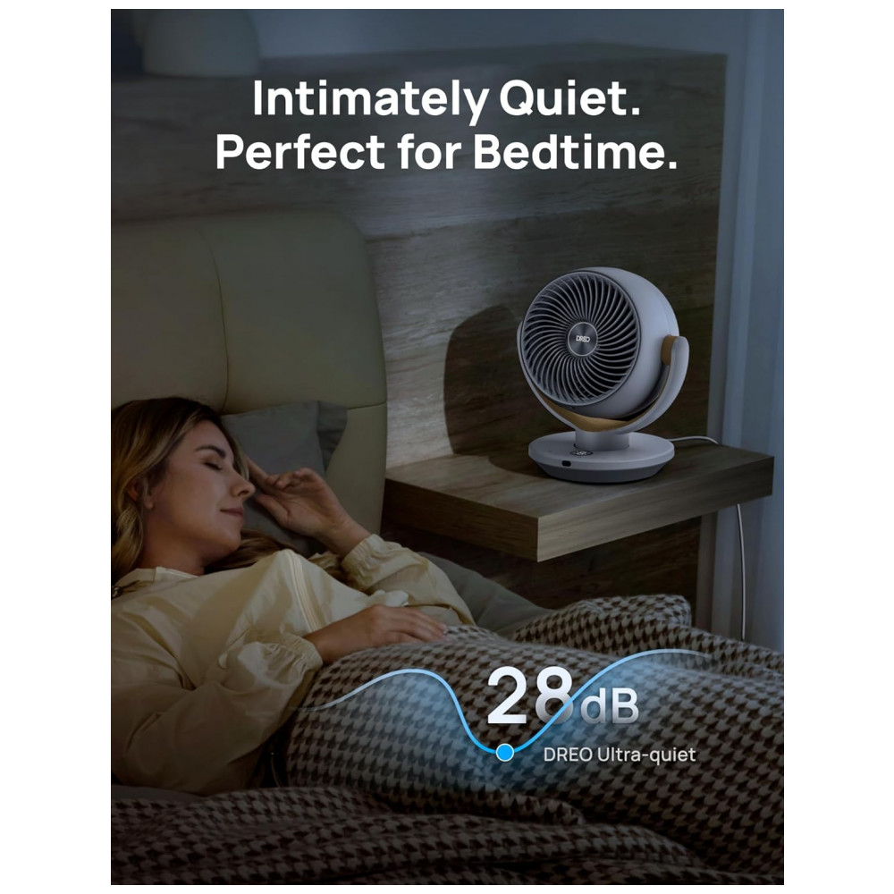 O Ventilador Circulador de Mesa Dreo modelo DR-HAF005 utiliza tecnologia TurboSilent com design airfoil para fluxo de ar de 20,66 m³/min e alcance máximo de 18 metros. Oferece 4 velocidades, 2 modos de vento, oscilação horizontal de 90° e inclinação vertical manual de 120° para cobertura completa de ambientes internos. Controle por painel touch ou remoto inclui timer programável de até 8 horas e desligamento automático da tela LED após 60 segundos.