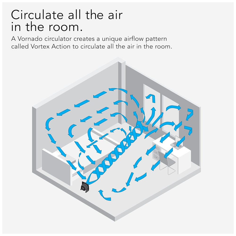 Apresentando o Vornado 573 Circulador de Ar Compacto com Painel Plano, um ventilador que utiliza a exclusiva tecnologia Vortex para mover o ar de forma eficaz em todo o ambiente.