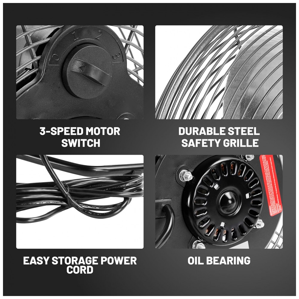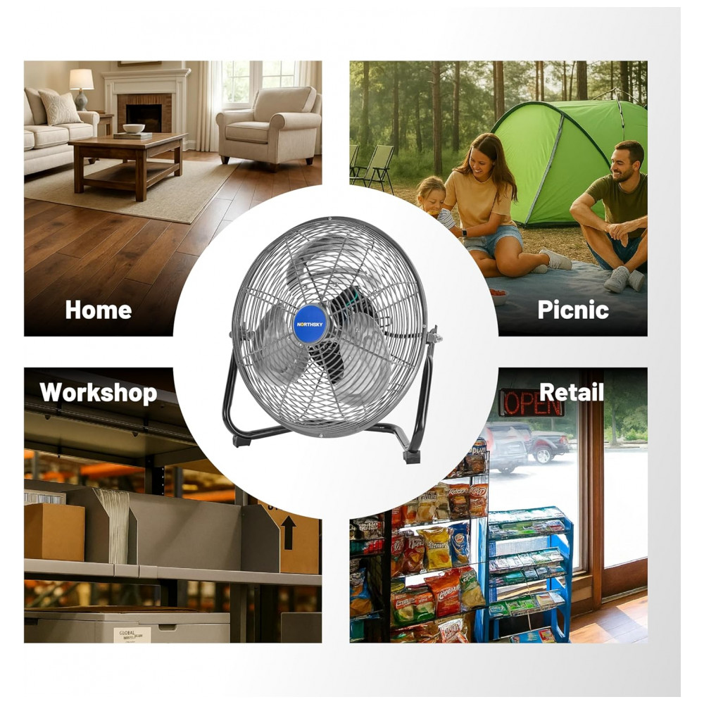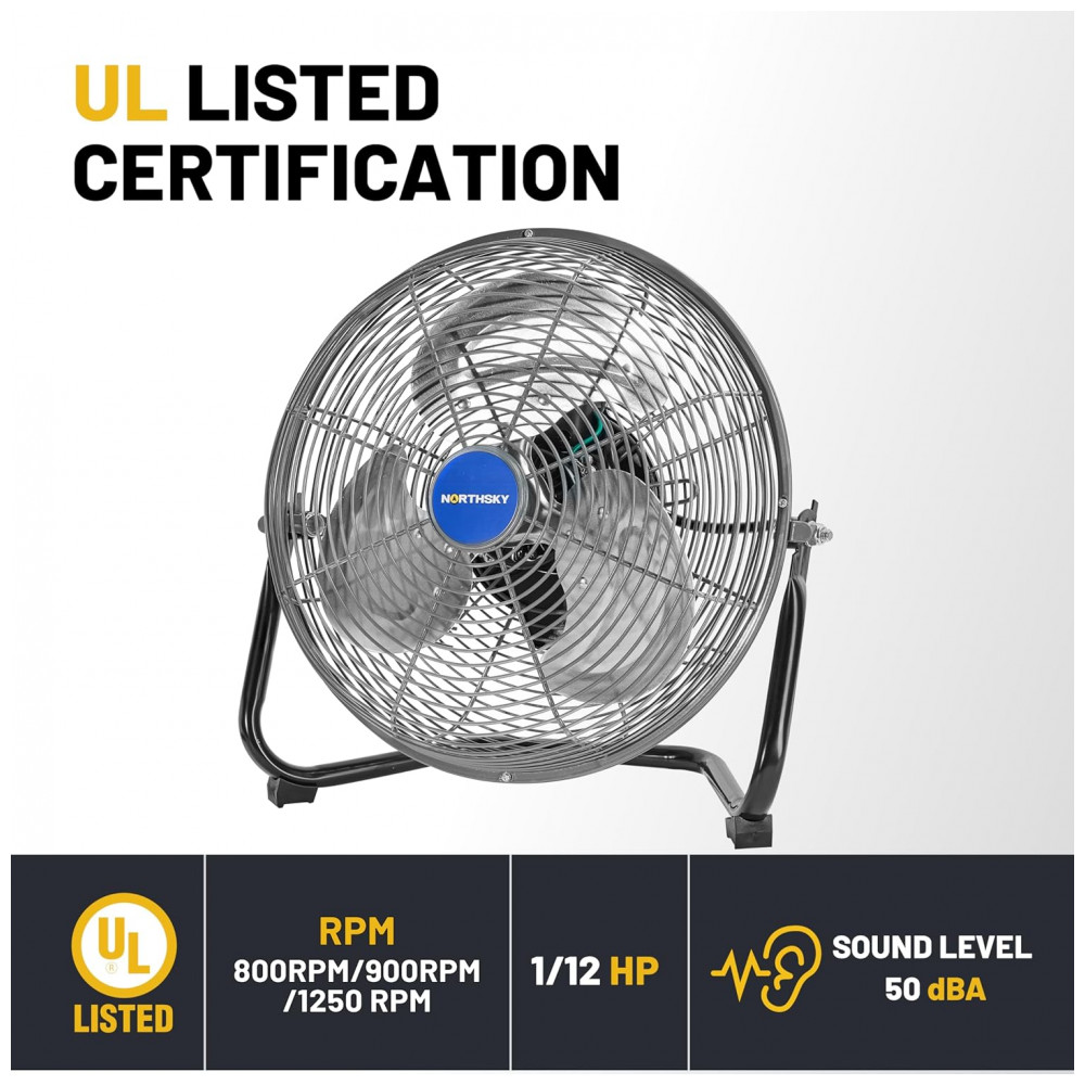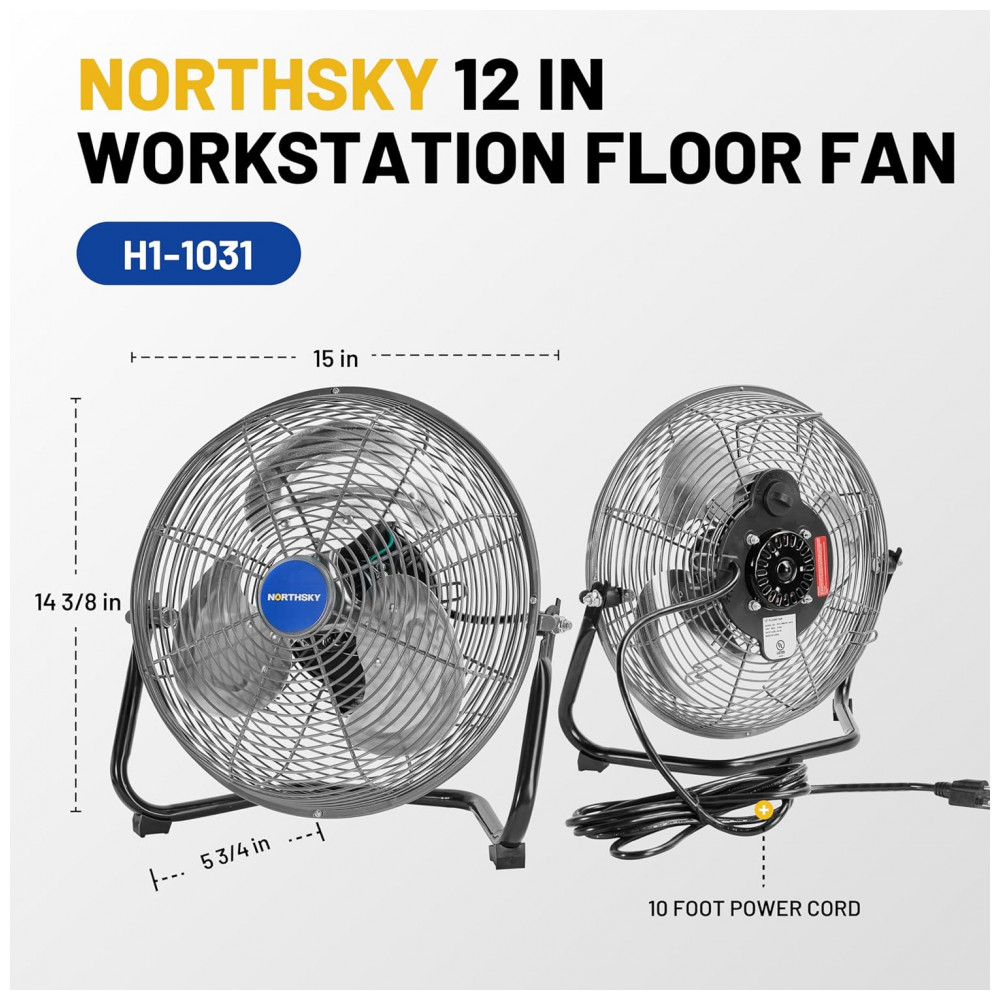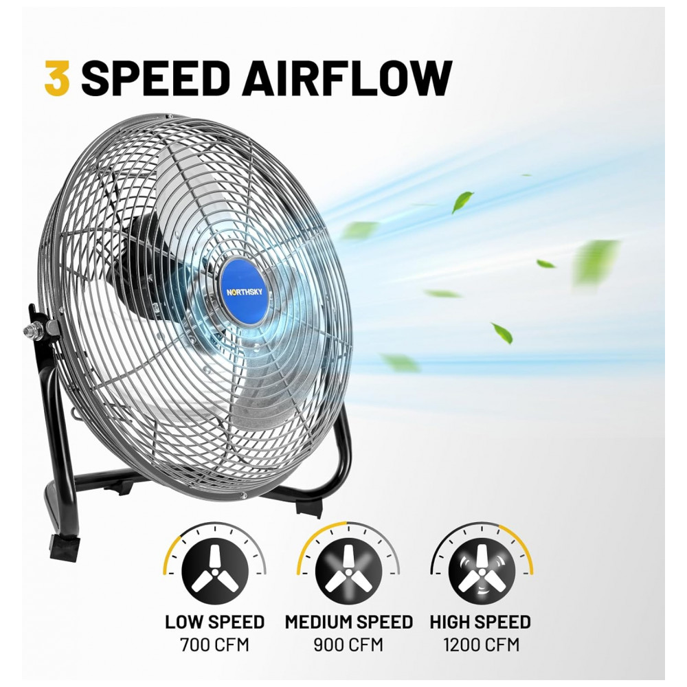 O Ventilador de Chão Industrial NORTHSKY modelo H1-1031 utiliza motor de 1,52 CV (49 W) com 3 lâminas de alumínio para fluxo de ar de 33,9 m³/min na velocidade alta (1200 CFM), média de 25,5 m³/min (900 CFM) e baixa de 19,8 m³/min (700 CFM). Oferece inclinação ajustável de 110° e rotações de 1250 RPM (alta), 900 RPM (média) e 800 RPM (baixa), controladas por interruptor traseiro. Construção em metal reforçado com grade de segurança em aço e rolamento a óleo garante durabilidade em ambientes industriais.
