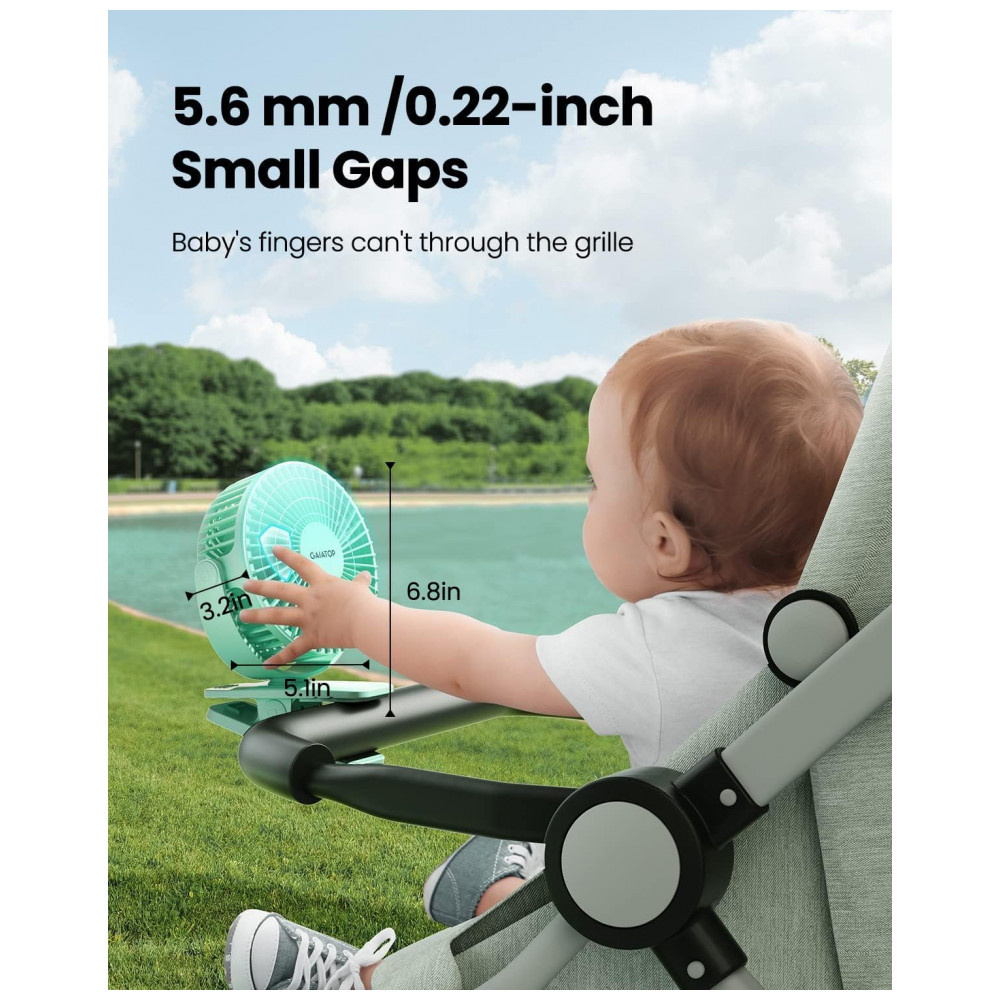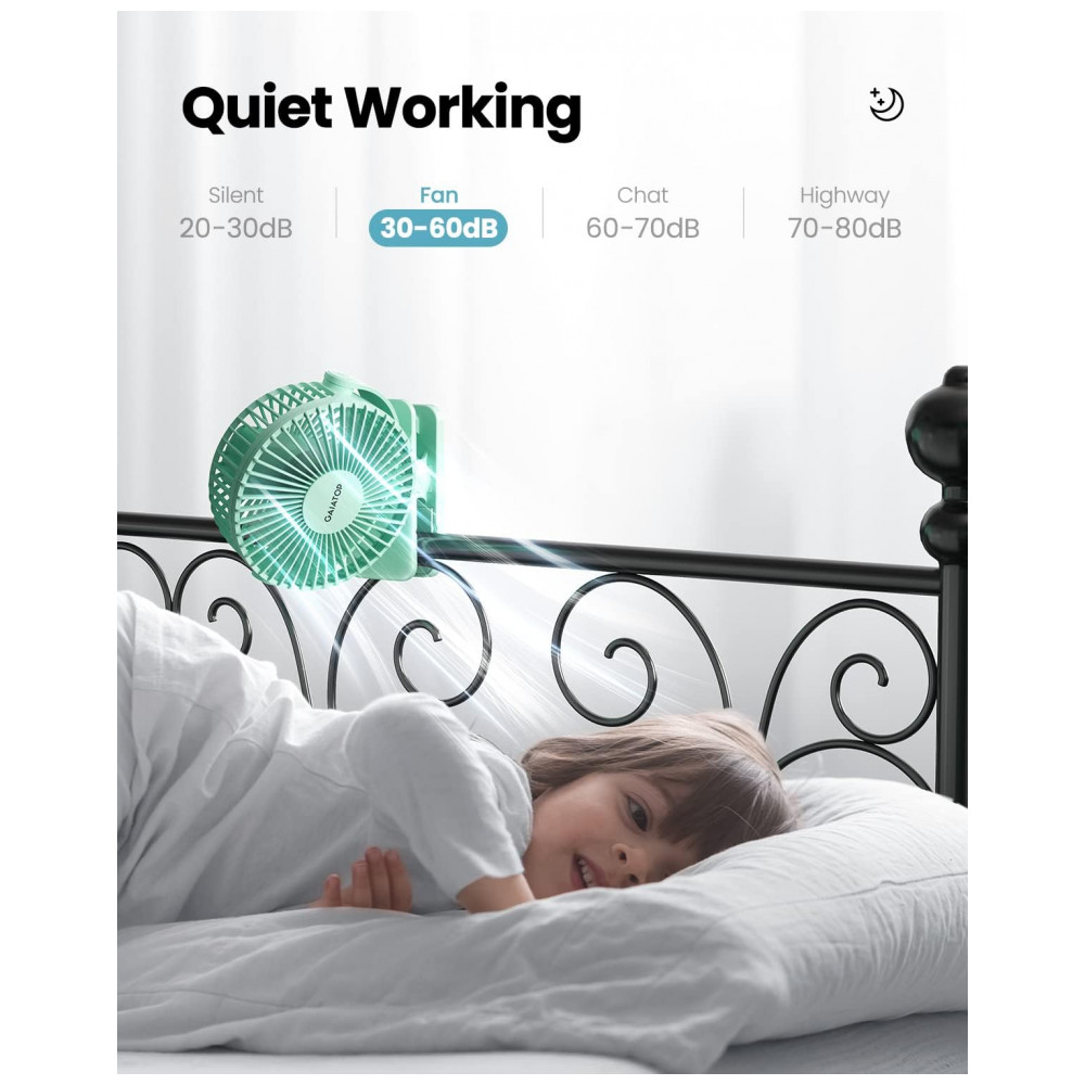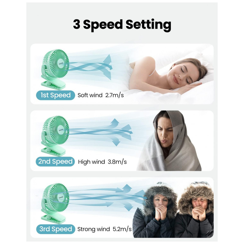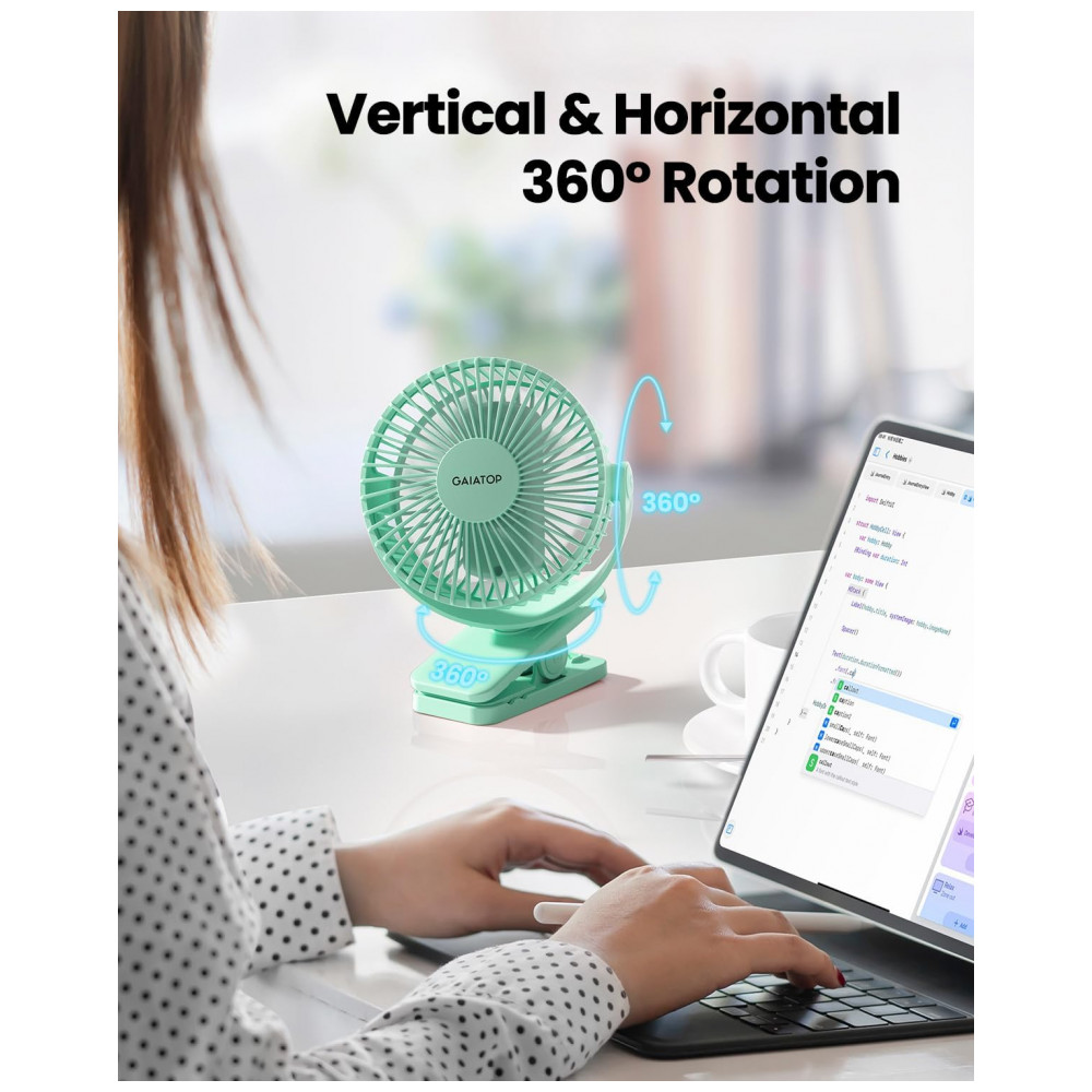 Ventilador de Clipes Portátil Gaiatop Verde Recarregável USB 3 Velocidades Rotação 360° Bateria 35-10h Mini Poderoso Silencioso Modelo CF40 5W