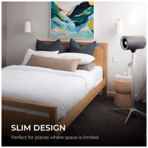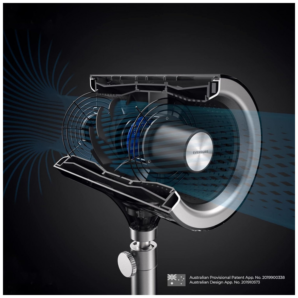 QUIET OPERATION This powerful, quiet fan brings a comforting, cool breeze as the body barrel forms an acoustic liner for quiet operation so you can sleep more comfortably. The slim design is ideal for places where space is minimal. UNIQUE AIRFLOW CONTROL Stay cool with 6 speed settings and an 80 degree left to right oscillation you can control the power and direct the airflow where you need. Also, direct air distribution up or down with the 40 degree adjustable head tilt. INNOVATIVE TECHNOLOGY Everdures pedestal fan is powered by a uniquely designed 150mm impeller providing a highly targeted airflow and constant air circulation through your home keeping you cool on those hot summer days. BEAUTIFUL DESIGN Enhance any space with this gorgeous pedestal fan. Great for bedrooms, living spaces, patios, and more. OSCILLATION 80 degree left to right oscillation available to provide variable cooling SLIM DESIGN Place this fan where you need it and dont worry about it taking up too much space AIR CONTROL A 40 degree adjustable head tilt allows you to direct air where it is needed LOW ENERGY USE Reduce your energy use by staying cool with Everdures standing fan