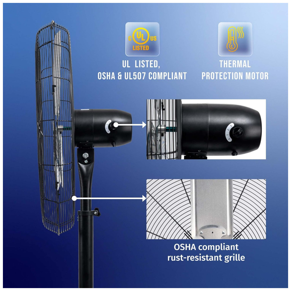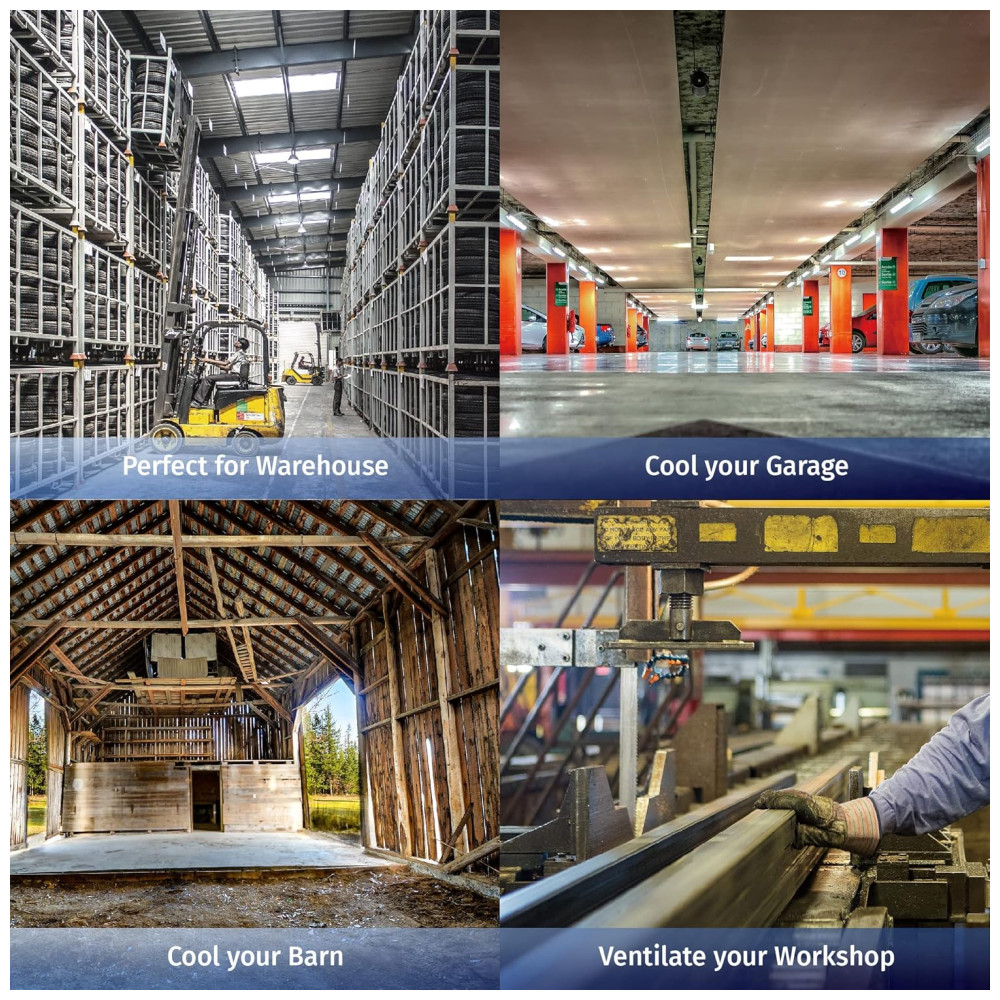 Construção Robusta e Durável: Feito de alumínio resistente e aço com revestimento em pó, possui uma grade à prova de ferrugem e hélices de alumínio em carcaça de aço pesado, ideal para ambientes industriais, comerciais, áreas cobertas, armazéns e fábricas.