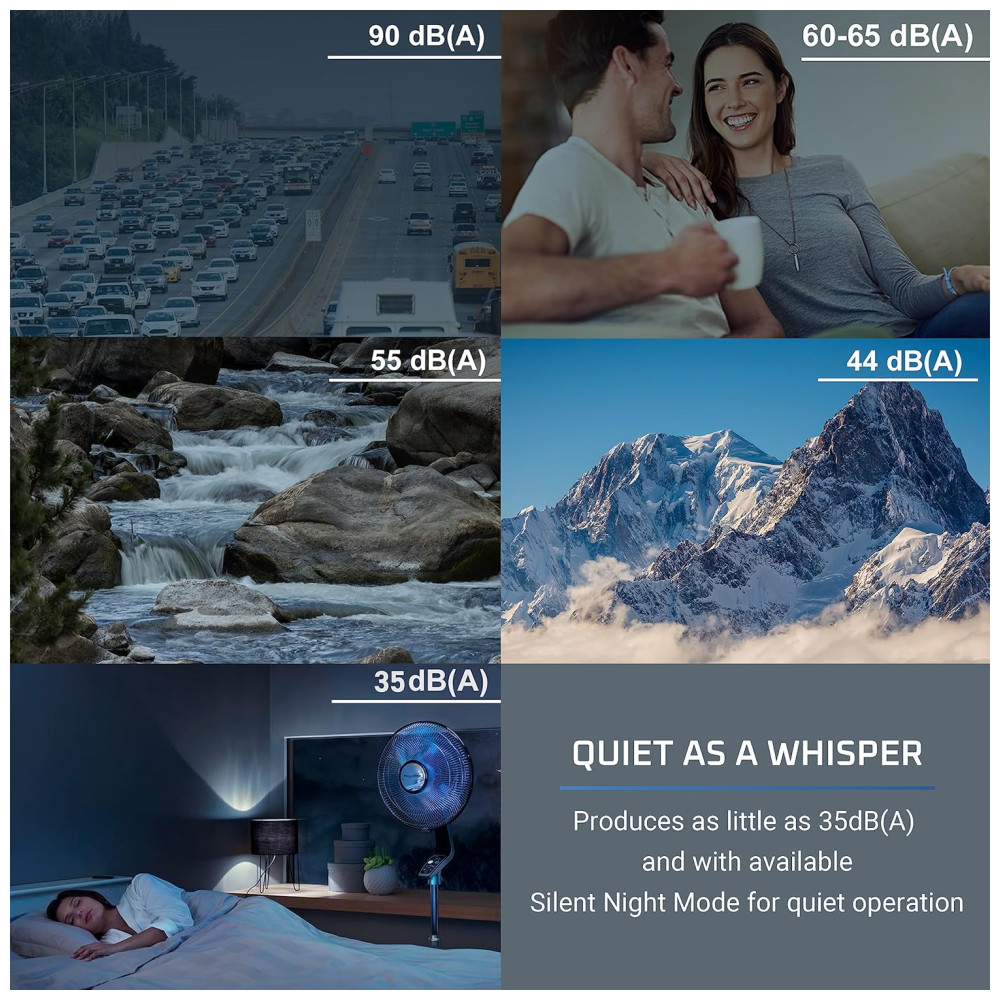 5 configurações de velocidade: escolha entre 3 velocidades padrão e 2 velocidades adicionais, incluindo o Turbo Boost para potência extra e o modo Silent Night para um funcionamento especialmente silencioso durante a noite.