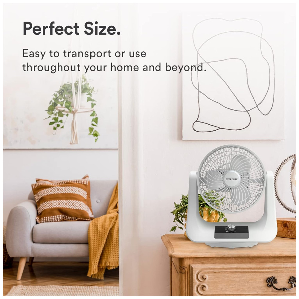Design Compacto – O design pequeno e clássico do Ventilador de Mesa Everdure o torna uma adição prática e elegante a qualquer ambiente. Seja na mesa de cabeceira, na escrivaninha do escritório, no balcão ou em uma prateleira, este ventilador silencioso e potente proporciona uma brisa refrescante que aumenta o conforto do seu espaço. DIMENSÕES: 29,5 cm (L) x 19,8 cm (P) x 32,7 cm (A).