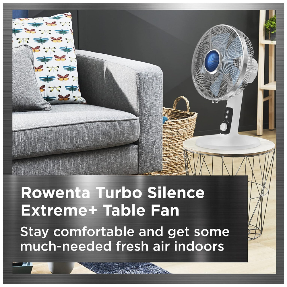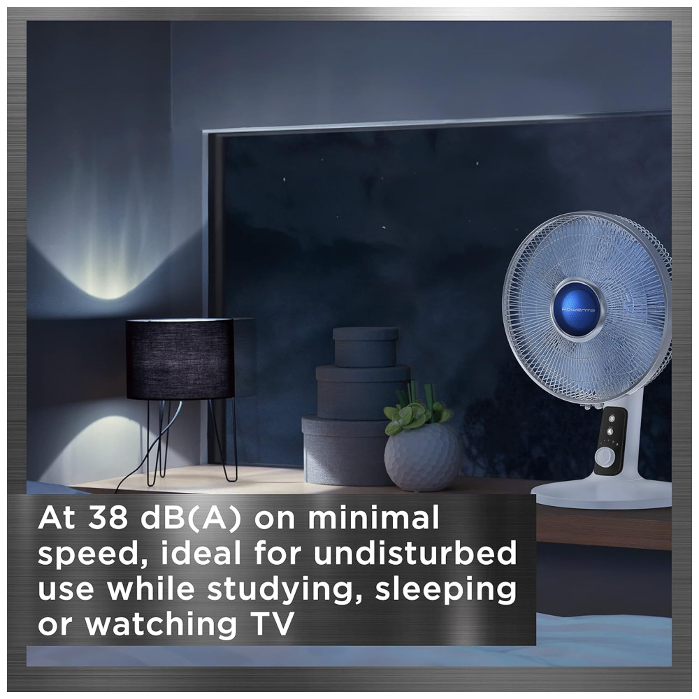 Apresentando o Ventilador de Mesa Rowenta Turbo Silence: aproveite um ar fresco e revitalizante sem o barulho. Este ventilador opera a apenas 38 dB(A) na velocidade mínima, ideal para uso tranquilo durante o sono, TV, trabalho ou estudos.