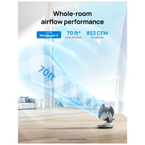 Descubra o Ventilador Inteligente Dreo para Casa: um potente circulador de ar que proporciona uma brisa refrescante em toda a sala. Alimentado pela tecnologia WingBoost da Dreo, ele oferece ventos que alcançam até 21 m, ideal para resfriar quartos, escritórios e salas de estar. (Diâmetro do Ventilador: 33 cm de altura, 18 cm de lâmina; Dimensões do Produto: 29 cm de profundidade x 26 cm de largura x 33,5 cm de altura).